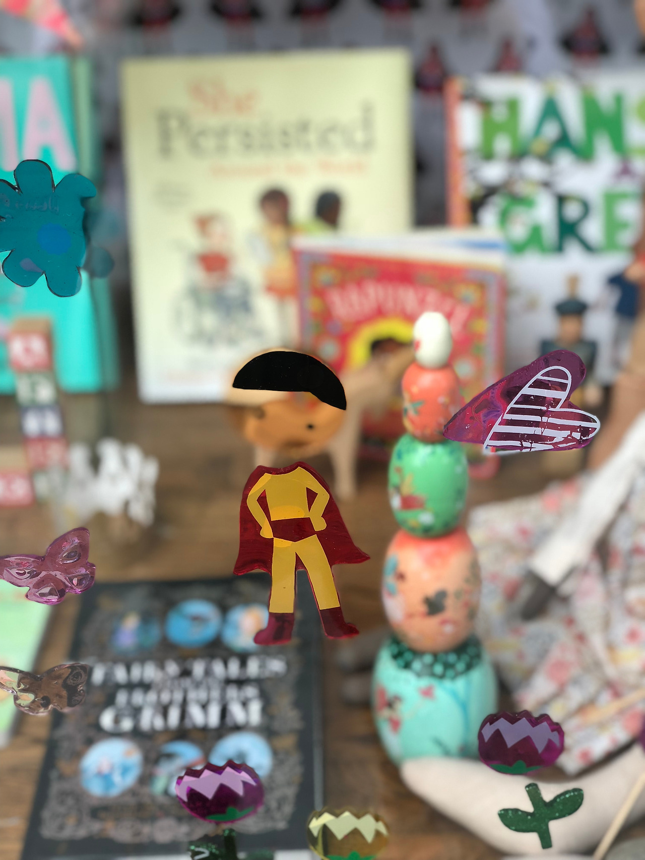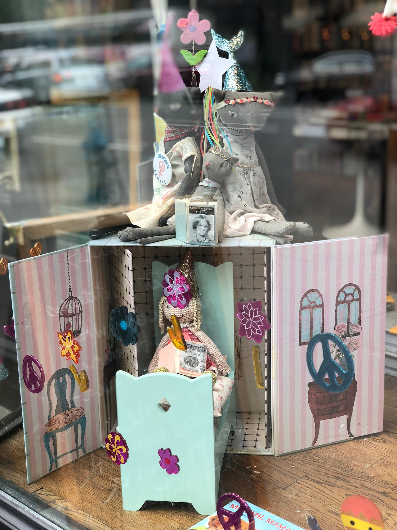 그런데 이 쇼윈도에 정렬된 책들이 너무 예쁜 것이었다. 아티스트의 표현력을 최대치로 불살라 책의 내용을 한껏 담은 표지 일러스트들이 제발 제발 좀 봐달라고 외친다. 아이들이라면 표지만 보고도 온갖 상상의 나래를 펼칠 것이다. 책 주변에는 이 표지들의 색상과 형태들이 주는 느낌과 잘 어울리는 장식품들까지 배치했다. 알록달록한 펠트 구슬과 파스텔톤의 패브릭으로 가랜드를 두르고, 목각인형, 헝겊인형, 퍼즐이 관람객처럼 앉아있다. 세상에 이 귀여운 다람쥐와 양과 고양이는 인어공주 꼬리모양의 반짝이는 고깔모자까지 쓰고 있다. 물론 어른들을 위한 책들도 폰트와 색, 형태의 조화와 대비가 그 책이 말하고자 하는 것의 느낌을 압축해서잘 표현해 놓은 것들로 골라두었다. 어떻게 이걸 그냥 보고 지나칠 수가 있을까. 이렇게나 정성들여 꾸몄는데. 자세히 안 봐주는 건 도저히 예의가 아닌 것 같다.