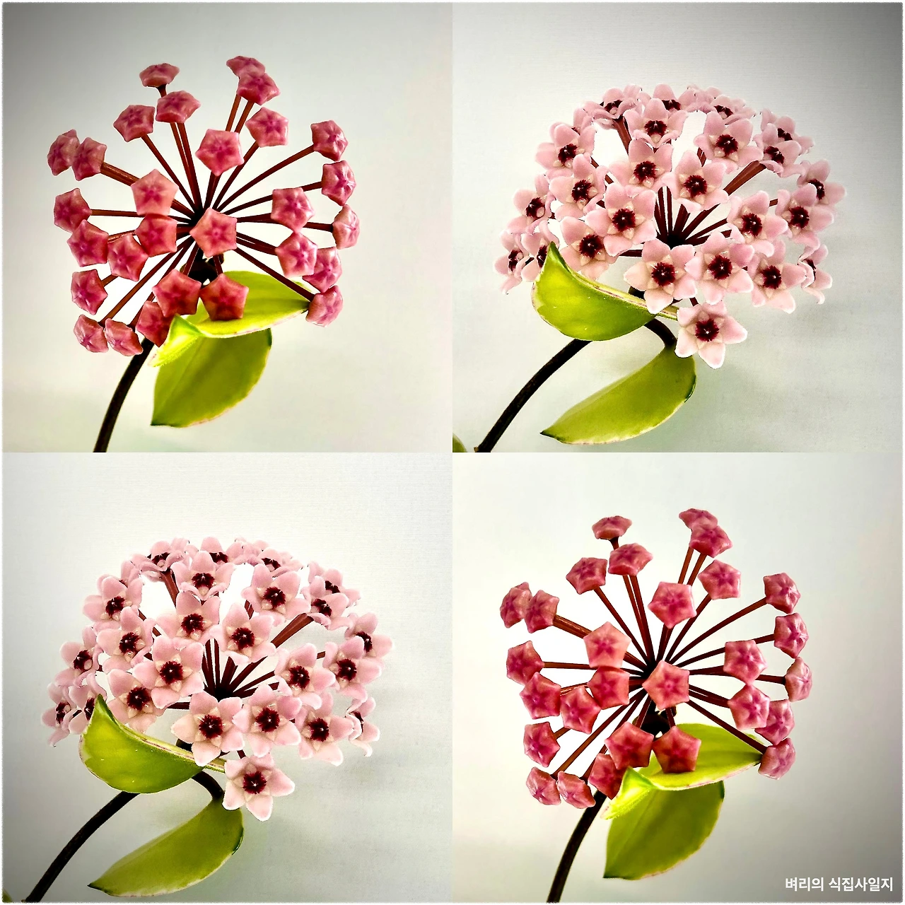하지만 삼형제를 키우면서 나는 색다른 경험을 하게 되었다. 따로 제 집을 갖게 된 호야는 쉴 새 없이 꽃무리를 피워냈다. 호야에서 꽃을 본 건 처음이었다. 재미있는 건, 호야의 꽃잎도 통상의 꽃잎과는 다르게 제 이파리처럼 두껍고 단단한 편이라는 것이다. 밀랍으로 만들어진 것 같은 질감에 약간의 광택이 돌아, wax flower라는 별명에 걸맞은 외형을 가졌다. 활짝 핀 호야 꽃은 투박한 질감과는 달리 꽤나 디테일이 정교하고 화려하다. 문제는 꽃봉오리 상태였다. 마치 연자방을 보듯, 무리지어 달린 꽃봉오리는 일종의 환공포증이 일어날 것만 같은 느낌이었다.