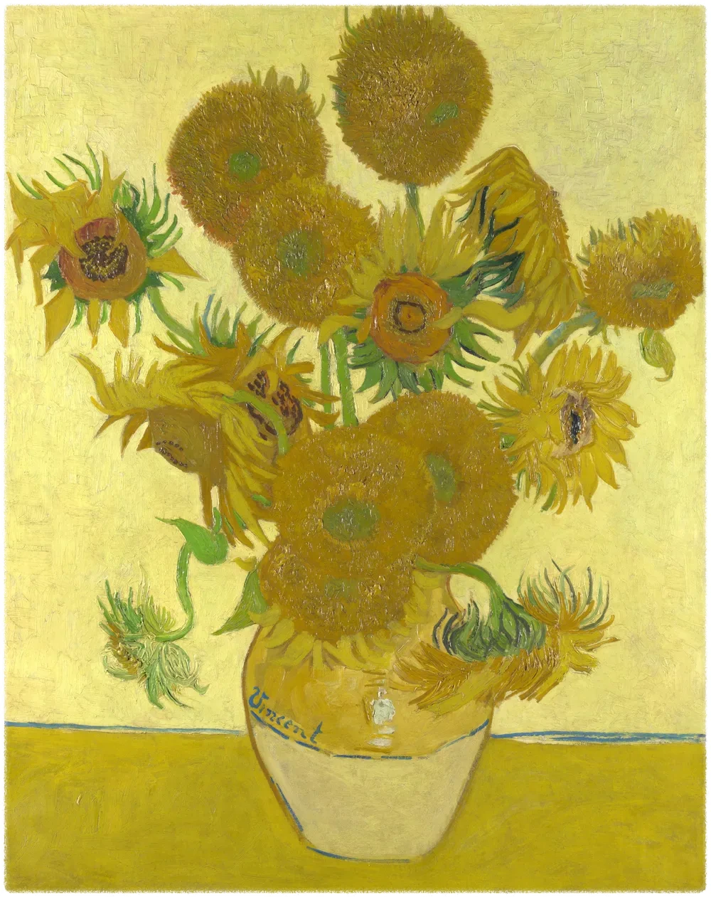 여기 고흐의 해바라기가 있다. 열다섯 송이의 해바라기가 노란 배경 위, 노란 꽃병에 담겨 일렁인다. 황금빛 찬란함이 정점에 달한 이 작품은 고흐의 해바라기 연작 가운데 가장 널리 알려진 런던 내셔널 갤러리 소장본이다. 미술사적 위대함은 잠시 접어두고, 우리는 오직 꽃의 얼굴에만 집중해 보기로 하자.