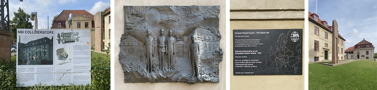 포인트: 1920년 설립, 코펜하겐 해석의 무대. 정문 앞 흉상, EPS Historic Site 플라크, Suspended in Language 부조