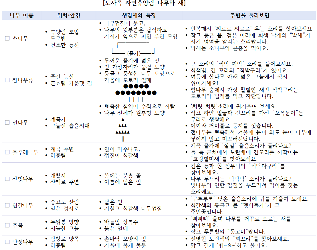 포인트: 도사곡 자연휴양림, 광공해 저감구역, 생물다양성 모니터링 구역