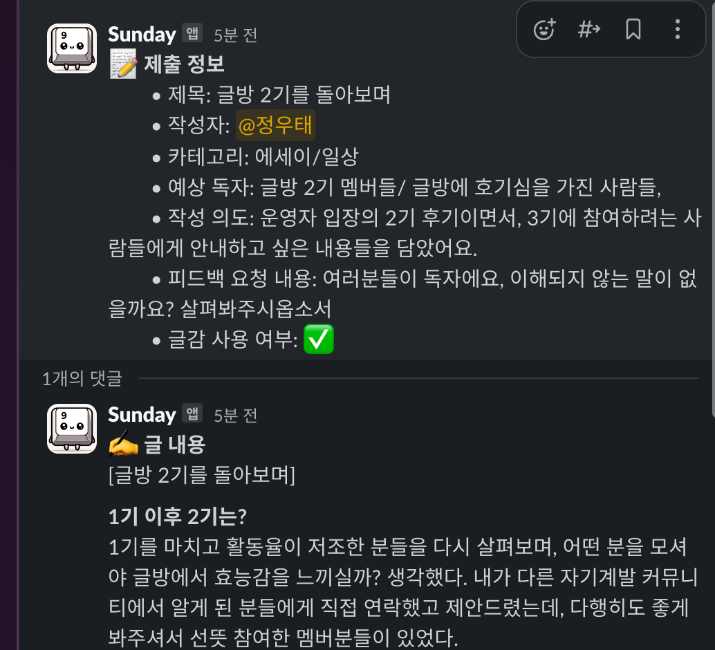 바로 슬랙봇이다. 슬랙봇은 슬랙에서 사용할 수 있는 (On-App) 같은 기능인데, 슬랙 위에서 개발자가 직접 필요한 기능을 추가로 만들 수 있다. 만든 슬랙봇은 “Sunday”라고 명명했다. 왜냐하면 일요일에 글을 제출하고, 동시에 사람들에게 자신을 돌아볼 수 있는 편안한 일요일이 생각나도록 하고 싶었기 때문이다. 2기에서는 주로 글의 제출과 제출한 글의 확인할 수 있는 글의 기능을 개발했고, 덕분에 2주차부터는 표준 양식으로 제출할 수 있었다, 더 이상 내가 다른 사람의 글을 복사해서 DB에 저장할 필요가 없어졌다.또한 글방에서 약속한 제출 기한 12시를 넘긴다면, 제출할 수 없도록 강제하도록 했다. 이로써 글방의 유일한 원칙인 1주일에 글 1개 제출을 내가 직접 체크하지 않고 시스템이 생겼다.