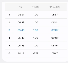 1~2K 구간만 제외하곤 모두 5분대 페이스로 달렸고 러닝 시간도 30분을 채웠다.