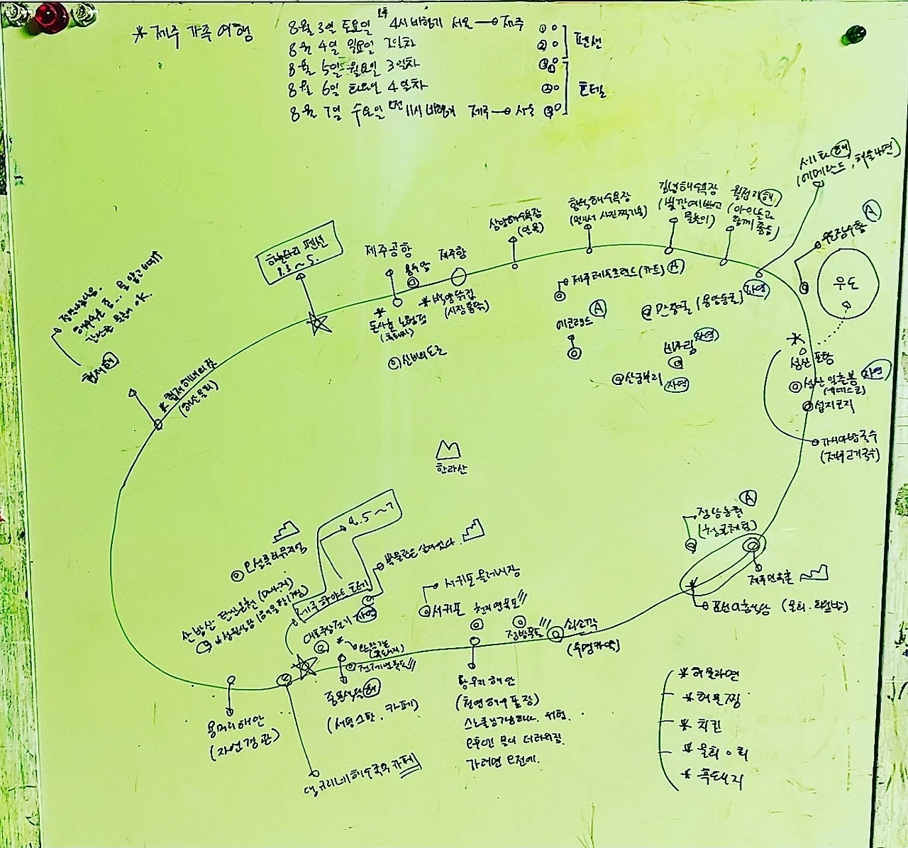 여러 번 가본 곳이지만, 아이들은 처음이라는 미명 하에 올해 초부터 미리미리 예약을 해둔 터였다. 그래서 좀 더 뜻깊은 시간을 보내고자, 회사에서 하던 보고와 회의를 가족과 함께 하기로. 우선 제주도를 그리고 갈만한 곳을 다 적었다. 해변도 많고, 박물관도 많았다. 먹을 것도 많았고, 볼 것, 체험할 것들도 한 가득. 어째, 제주도는 여러 번 가도 또 가보거나 새로이 가봐야 하는 곳이 화수분과 같았다.