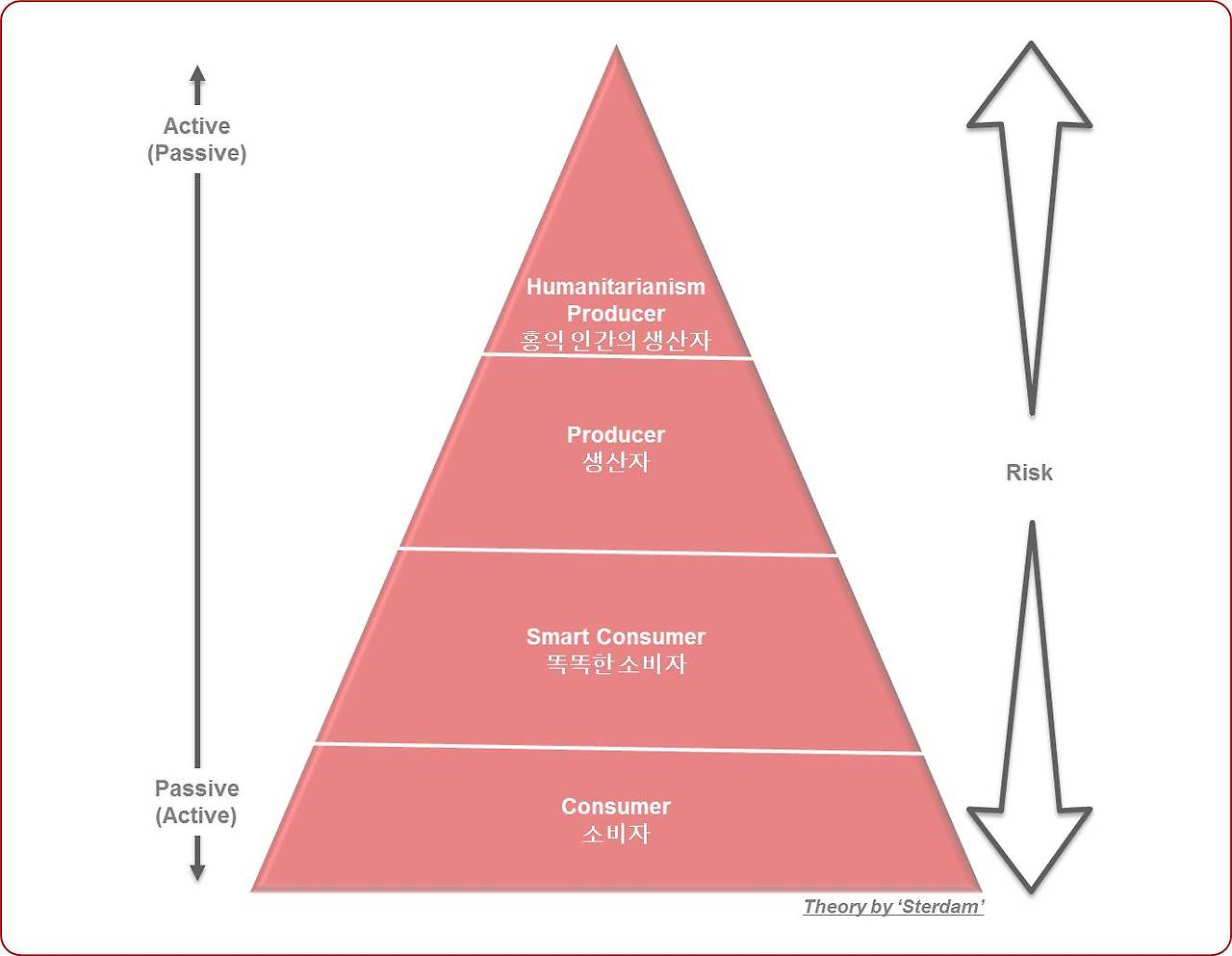 먼저, '홍익인간의 생산자'로 갈수록 '적극적'인 성향이 강하고 '소비자'로 갈수록 그 적극성은 약해진다고 봐. 단순한 Step이론 일 수 있어. 즉, 피동적으로 소비하던 사람이 조금 더 적극적으로 변하면 '똑똑한 소비자'가 되고, 계속해서 적극성이 강해지며 피라미드를 올라간다는 거지. 어떻게 보면, 적극성이 있어야 그 피라미드를 올라갈 수도 있는 거고. 100%는 아니지만, 크게 반대는 안하리라 믿어.