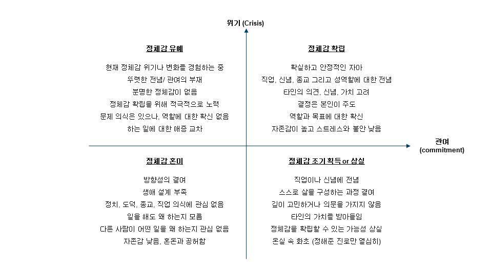 위기(Crisis): 직업선택, 이념적 신념과 같은 개인적 정체감의 측면들에 도달함에 있어 의문을 제기하고 적극적으로 여러 가지 대안을 탐색하는 시기
