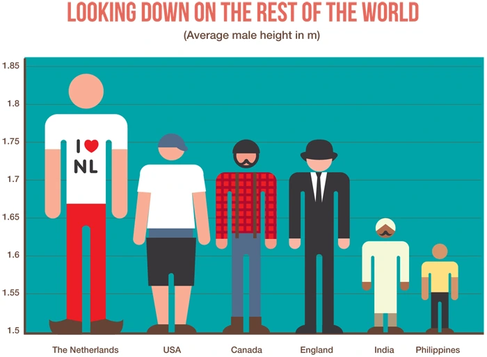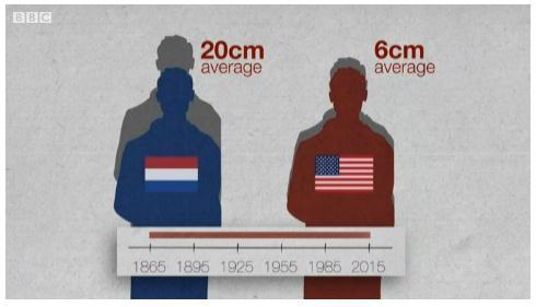 하지만 그로부터 150년이 지난 지금 네덜란드인의 평균 키는 20cm가 커져, 그 평균이 남성 184cm, 여성 170cm에 달한다. 같은 기간 미국은 6cm의 변화가 있었을 뿐이다.