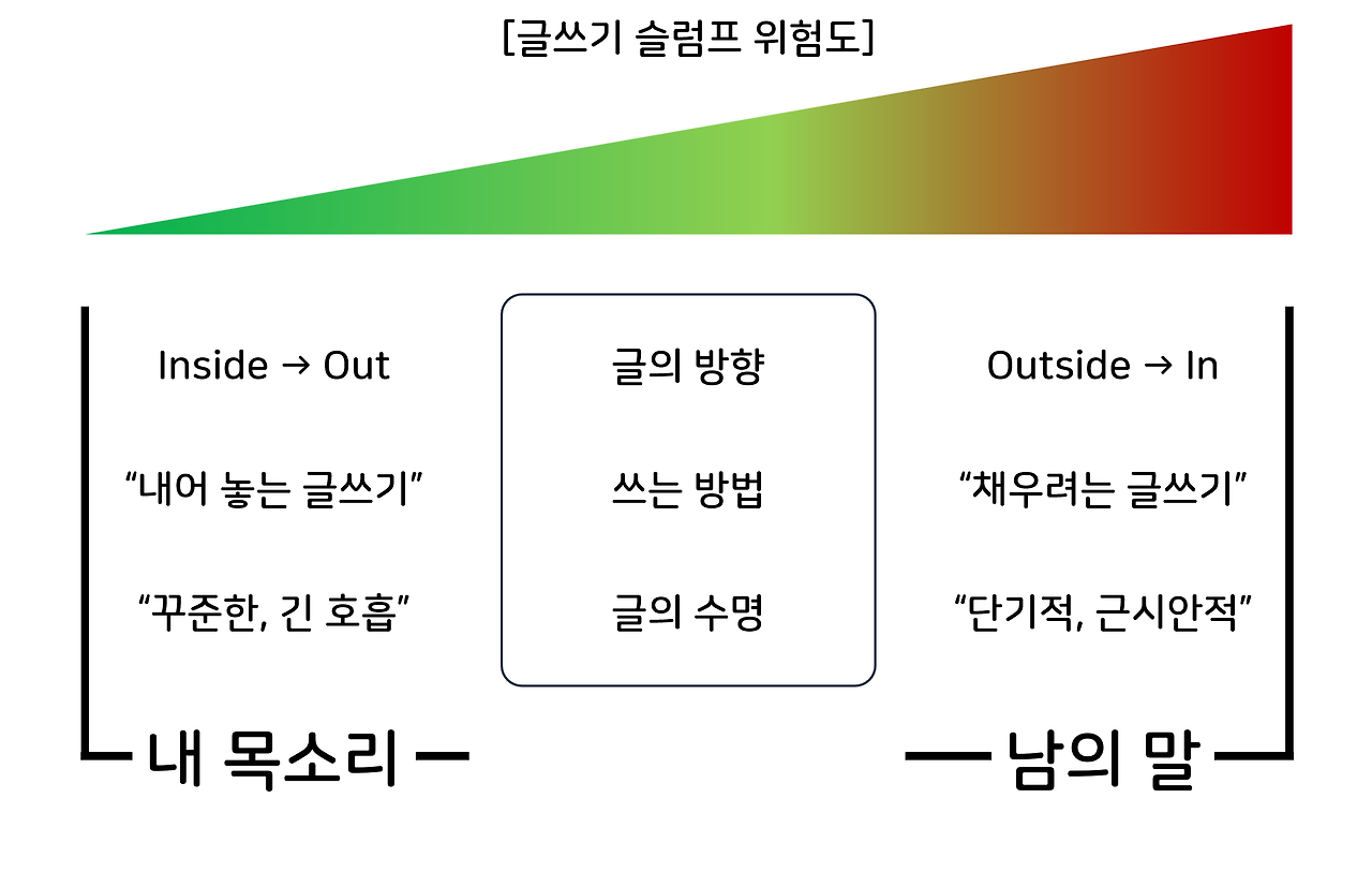 'Outside in'은 매우 위험하다. 물론 독서를 하고 양질의 정보를 받아 내재화하는 것은 매우 바람직한 일이다. 그러나 여기서 말하는 'Outside in'은 이와 결이 다르다. 글의 동기나 소재를 내 안이 아닌 밖에서 찾는 것. 그러니까, 내어 놓는 글쓰기가 아니라 채우려고 하는 글쓰기를 하는 것. 흰 여백을 채워야 한다는 강박, 누군가의 기대 수준을 맞추고 채워야 한다는 두려움 등.