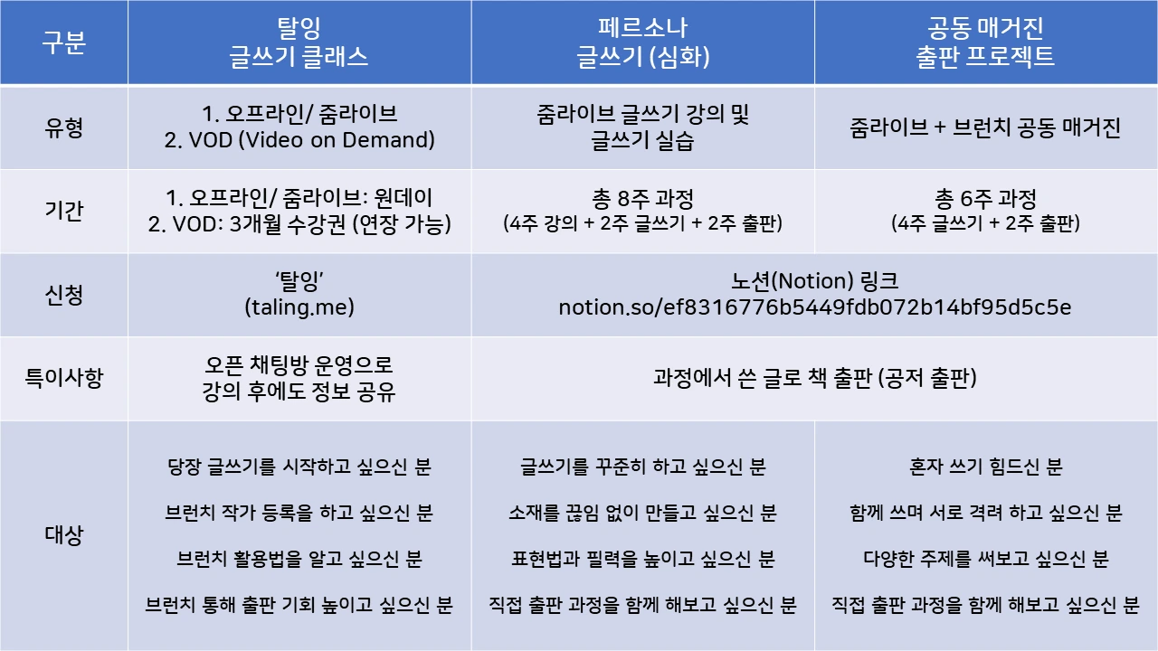 탈잉 강의를 들으신 분들께서 좀 더 필력을 늘리고 싶으시다는, 그리고 꾸준히 써나가며 실습을 하고 싶다고 하셔서 만든 과정입니다. 1기 모집이 끝났고, 과정 이후엔 실습한 글들을 모아 공저 출판을 할 예정입니다.