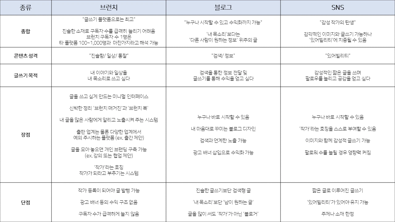 내가 글쓰기를 통해 얻고자 하는 것, 다른 사람에게 전달하고자 하는 것이 무엇인가. 이에 대한 대답은 그 누구도 해줄 수 없고, 플랫폼이 해답을 찾아줄 성격의 것이 아니다.