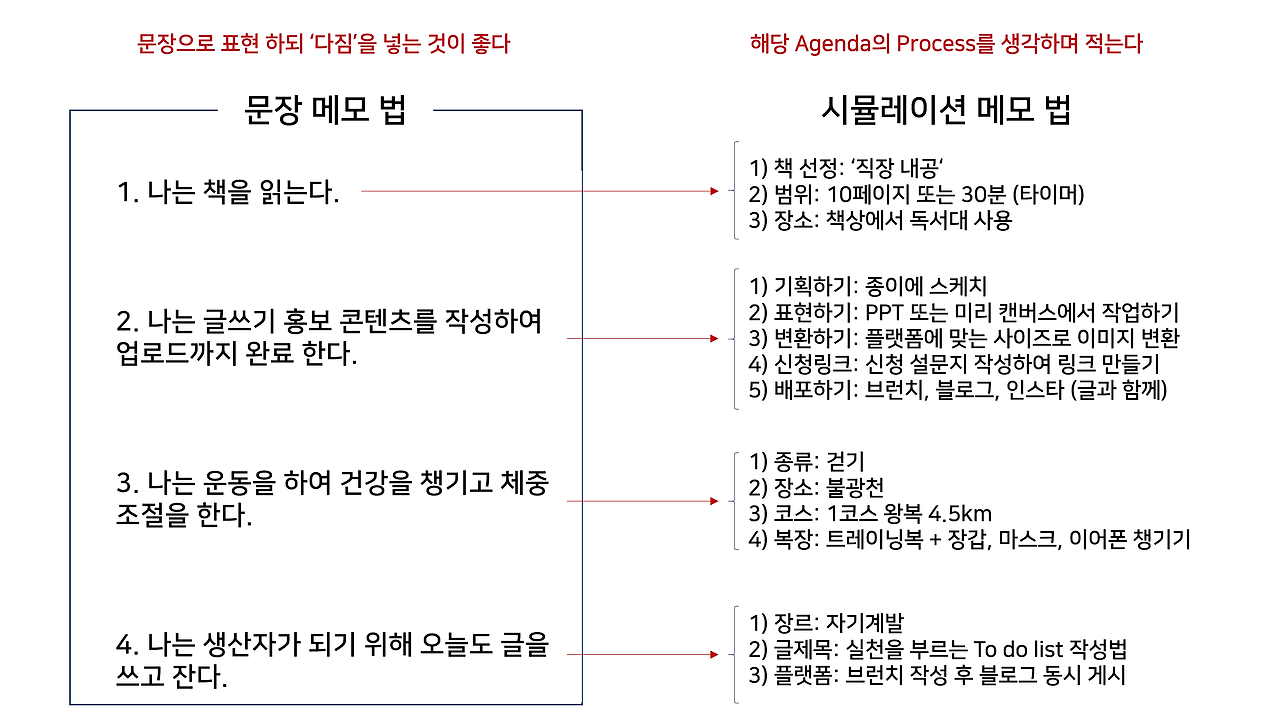 더불어, 그 이유와 과정을 담아 결국엔 현실적으로 실천하게 만드는 방법이 바로 '문장 메모 법'과 '시뮬레이션 메모 법'인 것이다.