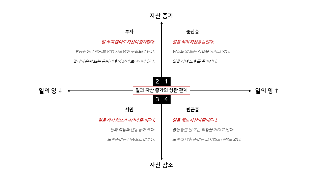 중산층은 일을 통해 자산을 늘리고, 부자로 가는 길목에 서 있는 사람이라고 볼 수 있어.