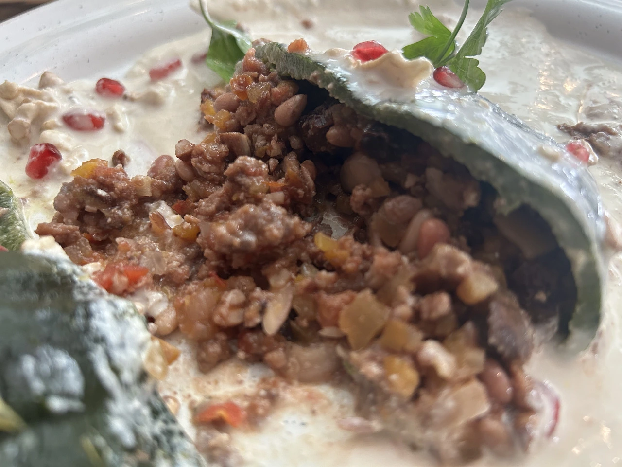 달달한 크림소스에, 다진 고기 조합이라니. 근데, 어라. 작은 땅콩 알갱이를 먹기 위해 아이스크림 전체를 먹는 견과류 열성팬인 내겐 신세계를 열어준 음식이다. 다진 고기 맛도 일품이지만, 거의 반을 채우고 있는 고추 안의 견과류는 음식으로 손이 가는 것을 말리지 못한다. 하얀 소스가 조금이라도 남을라, 접시를 핥고 싶다는 충동을 억누르며 샅샅이 포크질을 하게 된다.