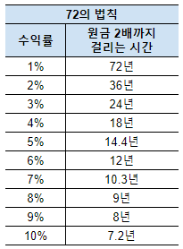 너희가 열심히 일을 해서 1,000만 원을 모았어. 원금을 2,000만 원으로 만들려면 24년을 꼬박 기다려야 해. 그런데, 만약 너희가 10% 수익률을 올릴 수 있는 방법을 찾아낸다면 그 시간은 7.2년으로 급속하게 줄어들겠지. 여기에 '복리(複利)'의 개념을 더해볼까. 복리는 원금과 그 원금에서 발생한 이자에도 또 이자가 붙는 걸 의미해. 1,000만 원에 3% 이자가 붙으면 1년 후엔 1,030만 원이 되겠지. 이걸 다시 재투자해본다면? 여기에 원금까지 조금씩 더 늘려간다면, 원금이 두 배가 되는 시점엔 추가로 투자한 금액을 제하고도 이익 금액은 두 배가 된단다.