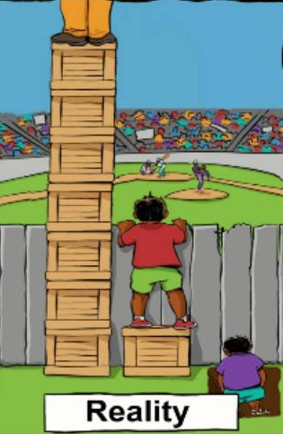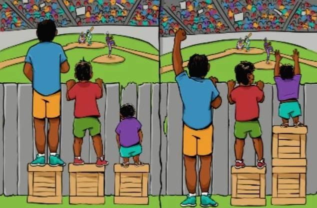 왼쪽은 '평등'과 '공평'의 개념일 거야. 우측은 '형평'과 '공정'의 것이고. 무조건 나누어 줄 것이냐, 상황을 고려하여 나누어 줄 것이냐의 차이. 하지만 이러한 판단은 쉽지 않아. 왼쪽은 가장 키가 작은 사람이 불만을 가질 수 있지만, 오른쪽은 키가 가장 큰 사람이 불만을 가질 수 있지.