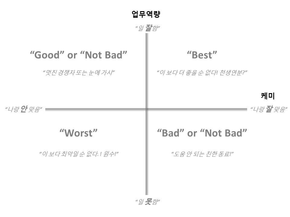 직장이라 할지라도, 우리 주위엔 좋은 사람들이 매우 많다. 형과 누나, 오빠와 언니의 호칭도 불사할 정도로 가까운 사람들이 있다. 그렇게 편한 사람들이 있다는 것이 어쩌면 직장생활의 조그마한 낙일 지도 모른다. 하지만 장소가 '직장'이란 문제가 있다. 일로 엮어진 사람들에게 '일'은 기본 전제여야 한다. 아무리 호형호제를 하며 술잔을 기울이고 새벽까지 어깨동무를 하며 간밤의 숙취를 이른 아침 같이 푸는 의리로 엮인 사람들일지라도, 현업에서 함께 일하다 서로 실망하는 경우를 자주 보게 된다. 어쩌면 친할수록 서로 일을 잘해야 할지 모른다. 그 친분을 더욱더 공고히 하려면 말이다. 나 또한 실제로 친한 사람과 일 잘하는 사람은 구분해서 보는 편이다. 그래서 이전에도 이에 대해 글을 쓴 적이 있다. 쉬운 설명을 위해 아래 표로 요약해 본다. 아마 표를 보면 바로 느낌이 올 것이다. (참고 글: "직장 인연")