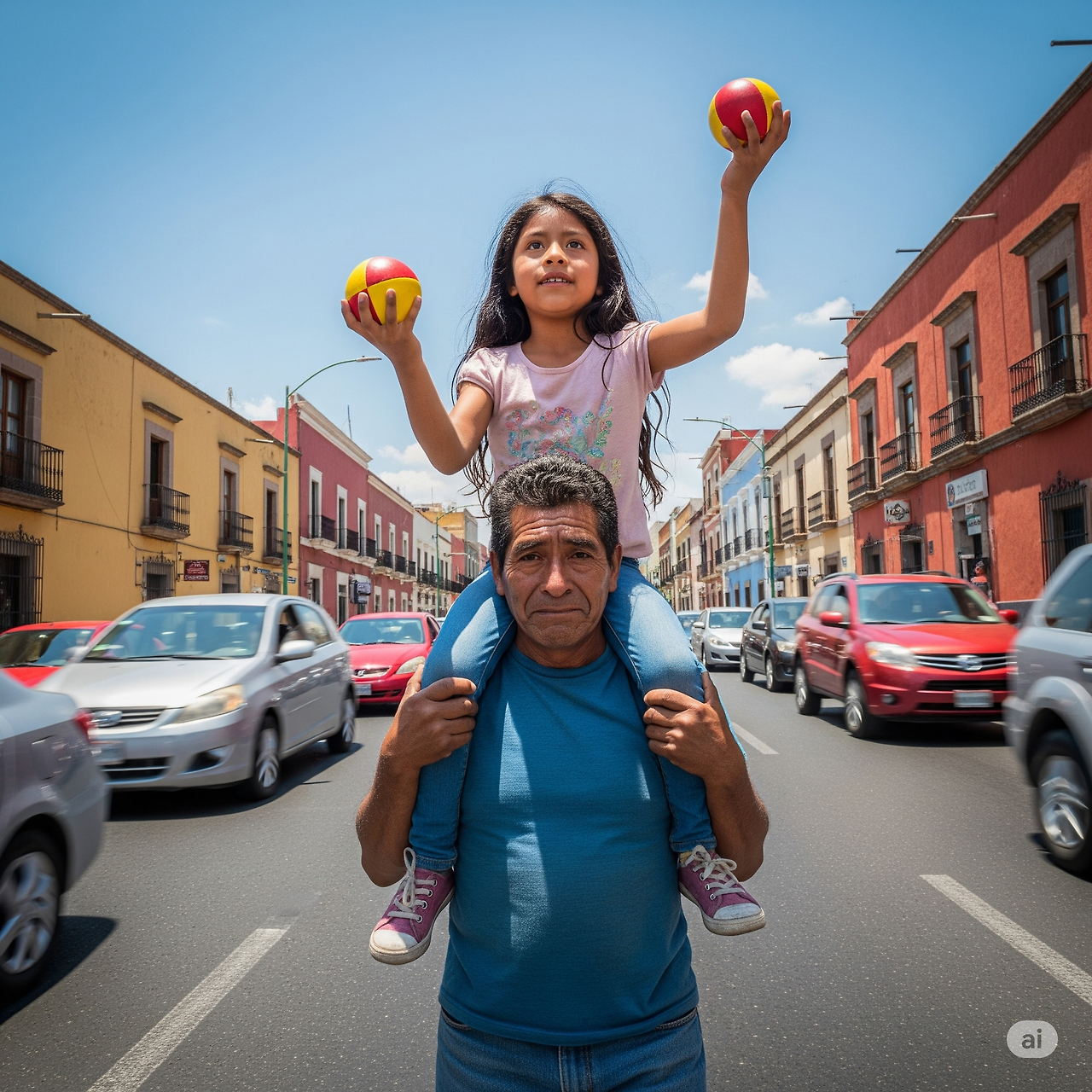 멀뚱히 차를 바라보다가, 또다시 신호가 걸리면 후안은 아일린을 어깨 위로 올려 서커스를 시작한다.
