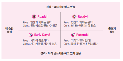 이 두 가지는 이제 글쓰기를 막 시작하려 하거나, 쓰다가 멈췄거나, 글은 쓰는데 아직 책을 내지 못한 모든 분들께 중요한 요소다.
