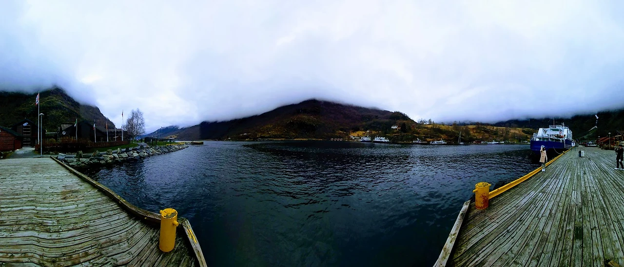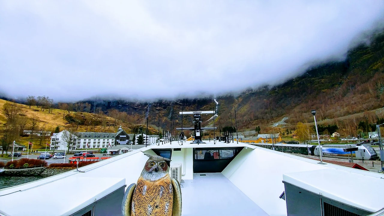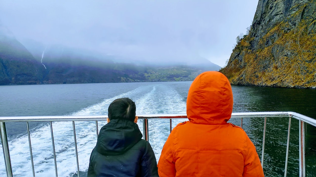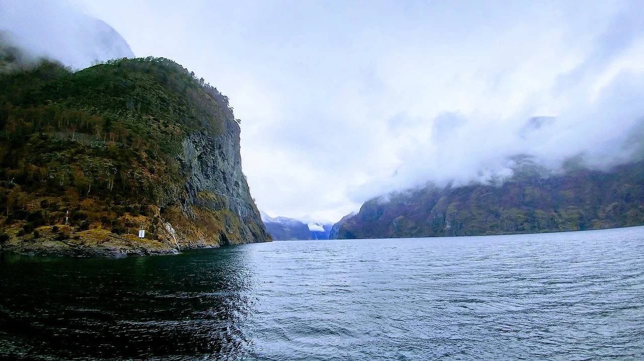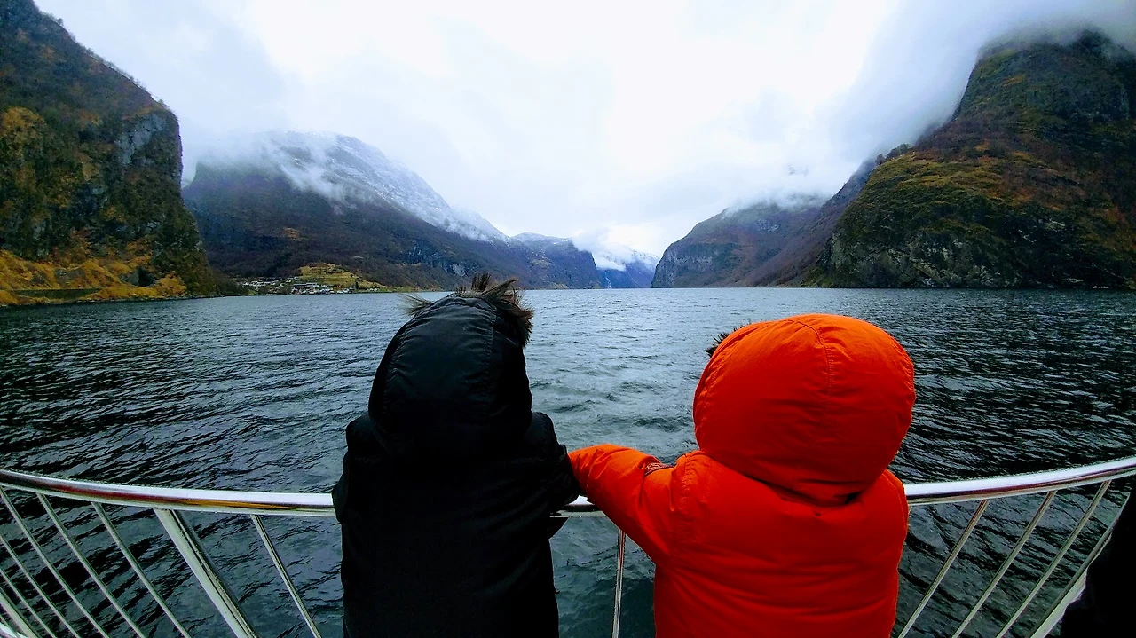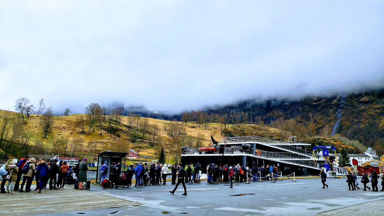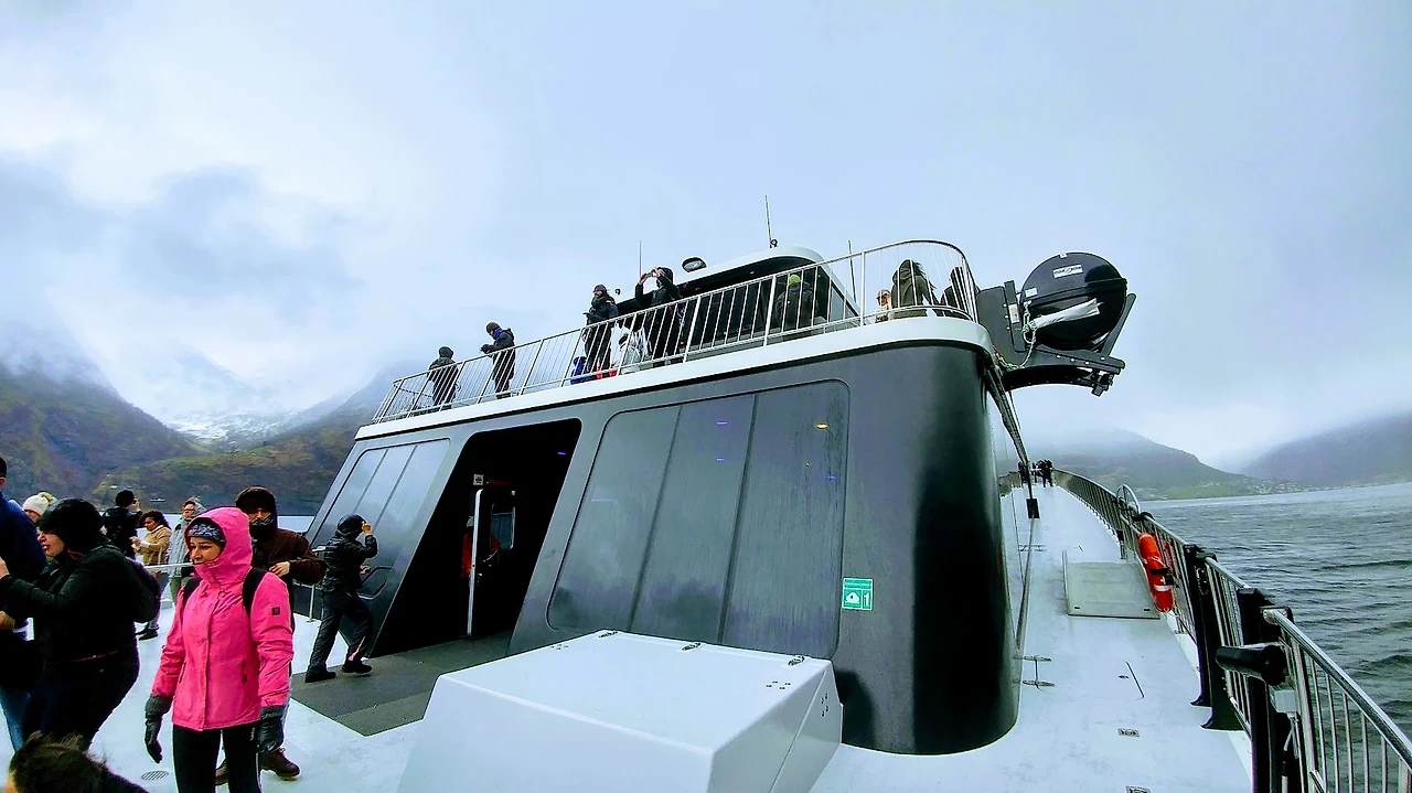 승선하여 1층부터 3층까지 빠르게 둘러본다. 아이들도 신이 났다. 구름이 맞닿은 요 앞의 산봉우리들이 피요르드를 향해 나아갈 준비를 하는 우리를 내려다보고 있었다. 배는 수많은 사람들을 옮기기 위해 영향 보충을 하고, 사람들은 사람들대로 자리를 잡느라 분주했다. 출발도 안 했지만 사람들의 카메라는 쉴 틈이 없었다.