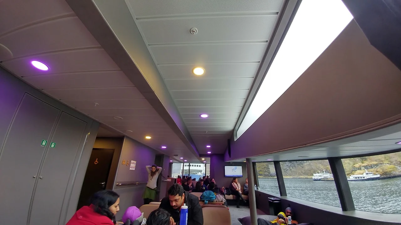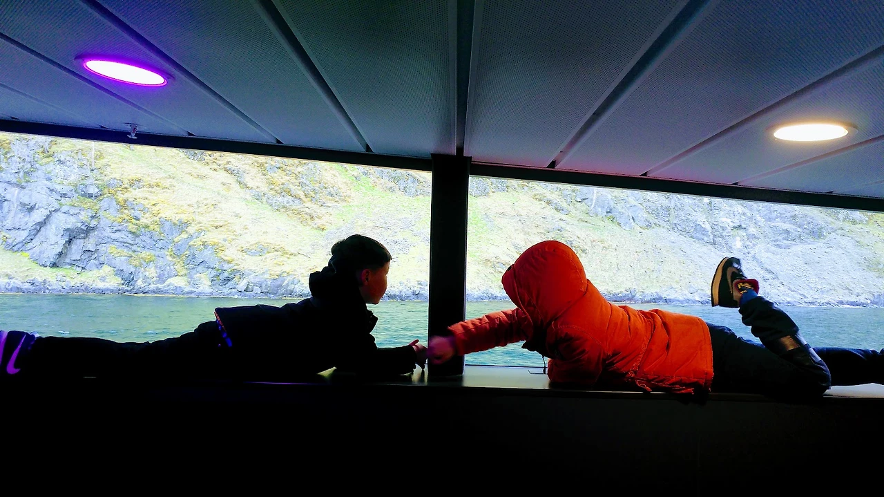 1층 실내에 자리 잡은 우리는 몸을 녹였다. 피요르드 근처에도 가지 않았고, 배가 속도를 낸 것도 아니지만 날씨는 제 역할을 다해 추위를 뿜어댔다. 다행히 자리 잡은 한 편에 공간이 있어 아이들은 이리저리 뒹구르며 여유를 만끽했다. 저렇게 어디서든 뒹구를 수 있다는 것 자체가 부러웠다. 옷이 더러워지거나 바닥이 더러울지 모른다는 걱정은 잠시 접기로 했다. 아이들의 얼굴에 웃음이 가득 차 있었기 때문에.
