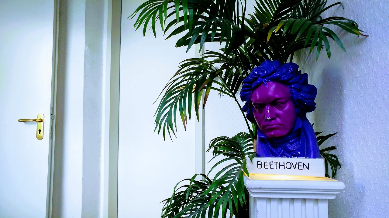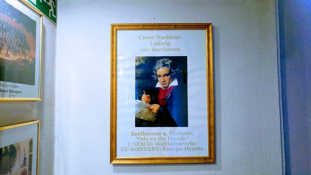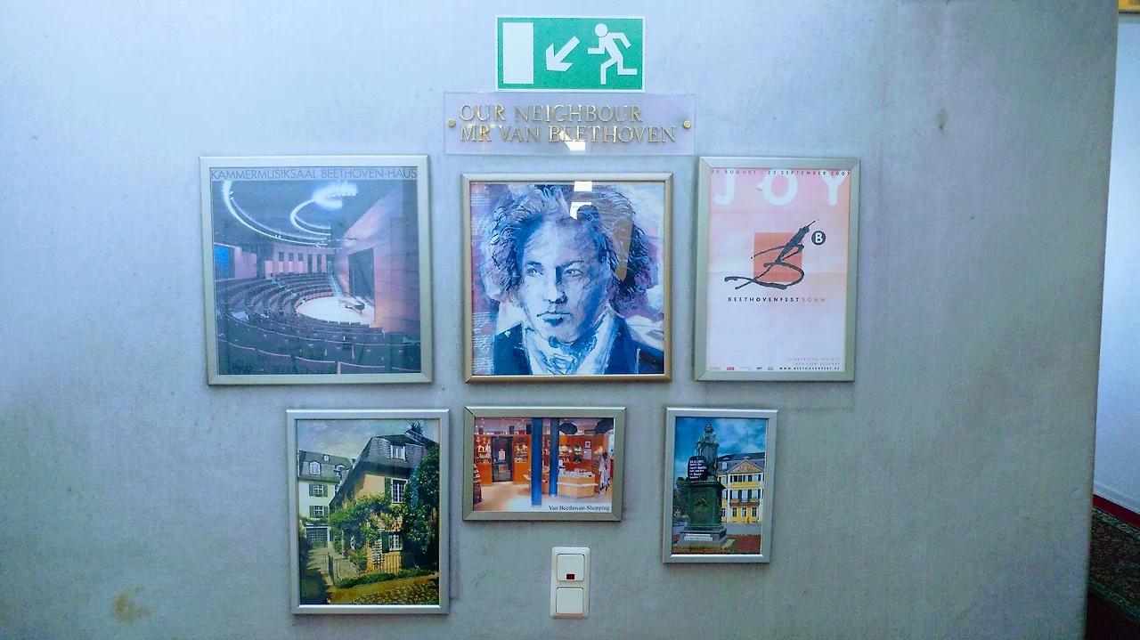 호텔은 중심가에 위치해 있었다. 호텔로 가는 길에 벌써 우리는 베토벤 생가를 지나치고 있었다. 토요일 저녁에 도착한 터라 입장은 다음날 아침을 기약해야 했다. 우측에는 호텔 이름이 '베토벤'이라고 큼지막하게 쓰여 있었고, 바로 그 옆에 작은 통로의 '베토벤 하우스 근처 Central Galerie' 호텔이 있었다. 좁은 통로로 오르는 동안, 삐걱거리는 바닥의 소리가 이 건물의 대략적인 나이를 말해 주고 있었다. 리셉션에는 건물의 나이와 매우 잘 어울리는 인심 좋은 독일 아저씨가 있었고, 독일 사람 치고는 꽤 괜찮은 영어로 이것저것을 안내해주었다. 중간중간 '아침'을 '모닝'이 아닌 '모건'으로 발음한 것 빼고는 큰 어려움이 없었다. 방으로 올라가는 곳곳에 베토벤의 흔적을 쉽게 찾을 수 있었다. 동상과 흉상, 두상은 물론 초상화들이 곳곳에 있었다.