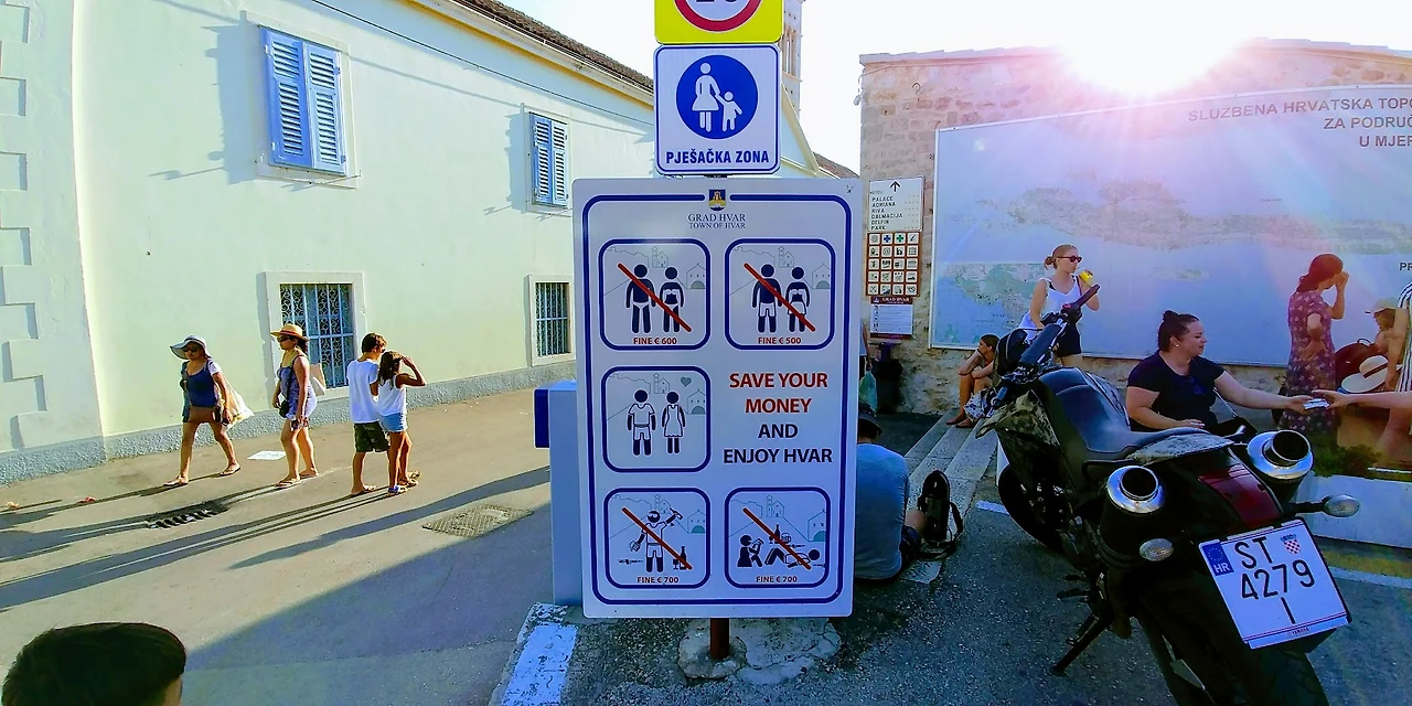 식사를 마치고는 흐바르의 시내로 향했다. 입구에는 예상치 못한 안내판이 있었다. 해변 도시라 마냥 자유로울 줄 알았는데, 시내에서는 수영복을 입고 돌아다니거나 술 먹고 주위 사람들을 불편하게 하면 벌금을 낼 수 있다는 경고판이 서있었다. 물론, 수영복을 입지 못하게 한다고는 하지만 관광객들의 옷차림은 여기저기에서 자유로움이 묻어났고 어떤 옷들은 수영복과 옷의 경계가 없는 것들도 있었다.