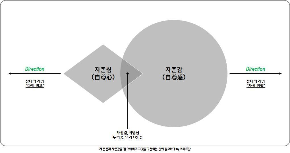 하지만 그 '자존심'과 '자존감'을 구분하고 그때를 바라보니 나는 '자존감'이 아닌 '자존심'을 상한 거였다. '자존심'은 '남'과 연관되어 있다. '남'에게 굽히지 않아야 한다는 강박. 그래서 나 자신의 가치를 지켜야 한다는 개념이다. '자존감'은 설명마저 간단하다. 스스로를 존중하는 마음. 누군가와 연결된 것이 아니라, 나의 절대적인 신념이다. 잠깐 아래 그림을 살펴보자.