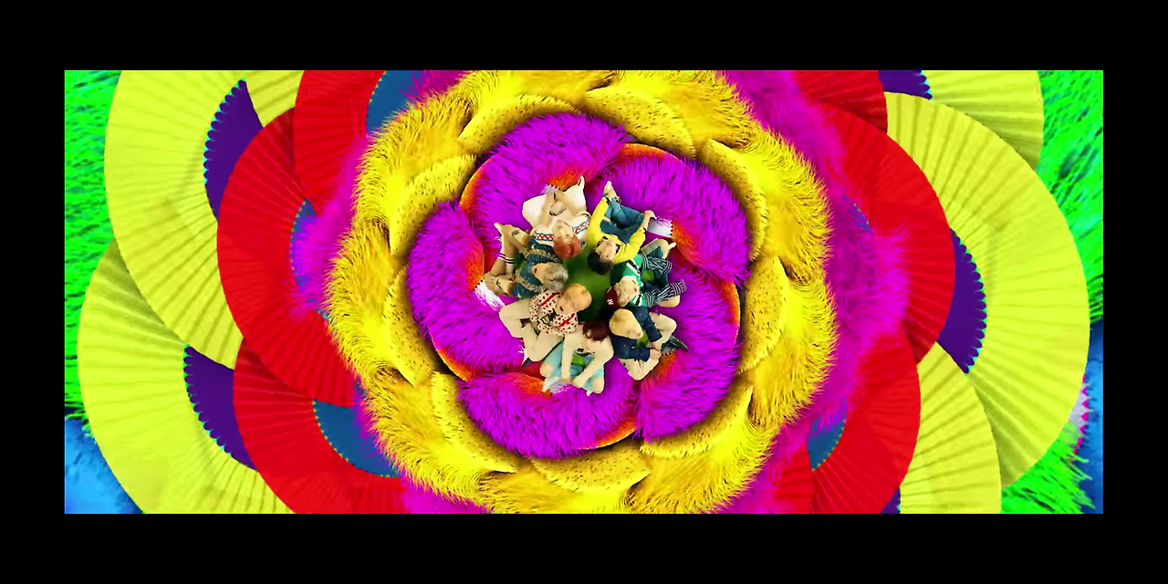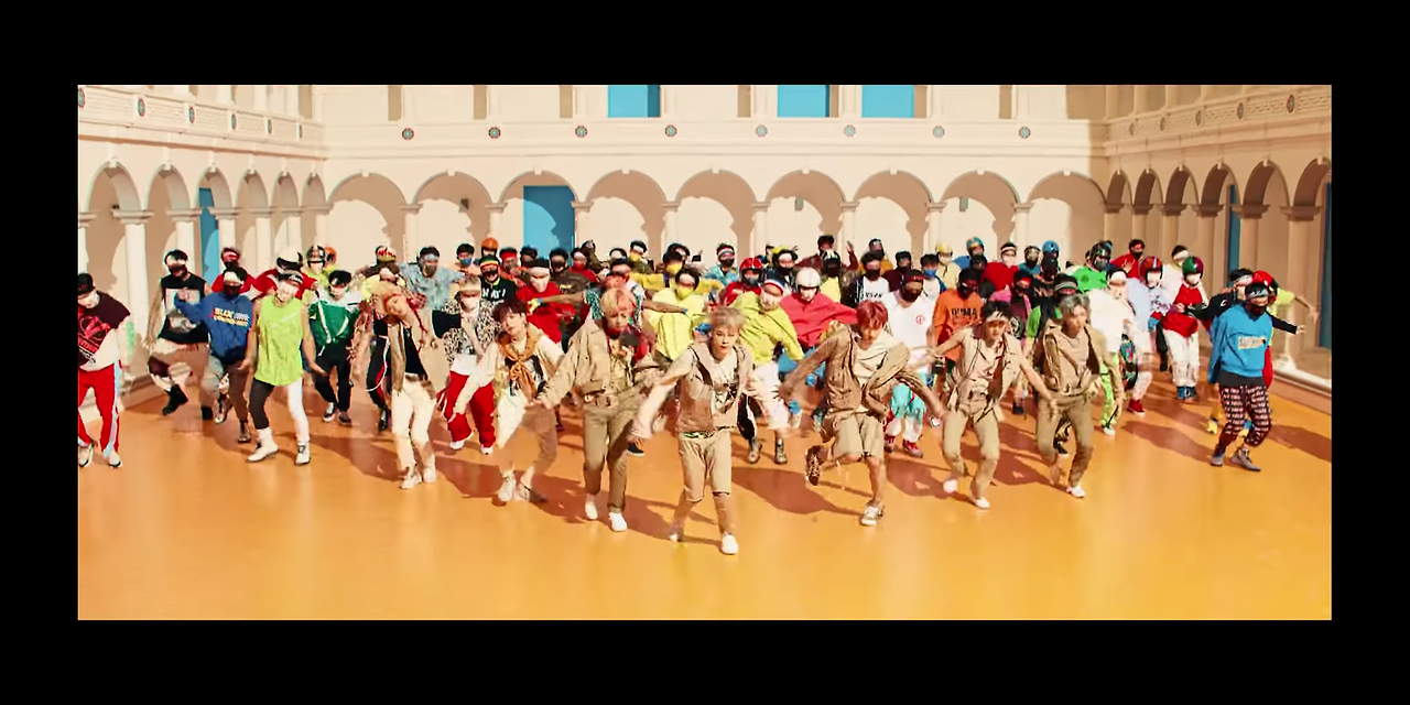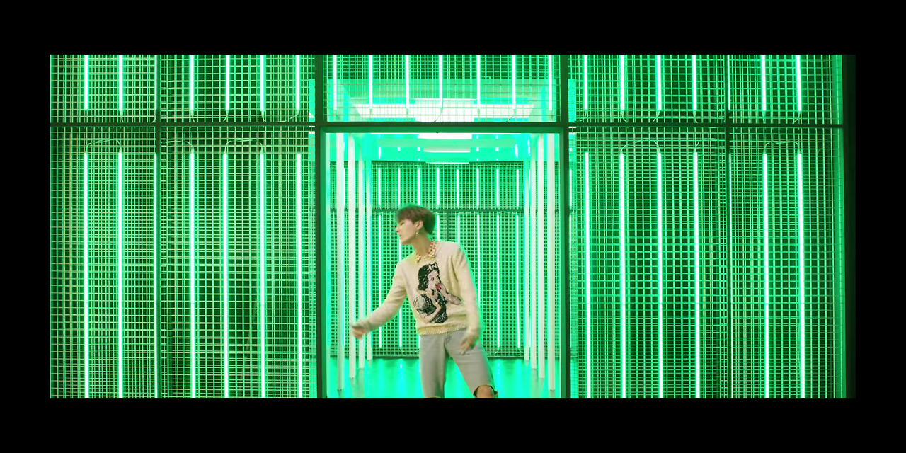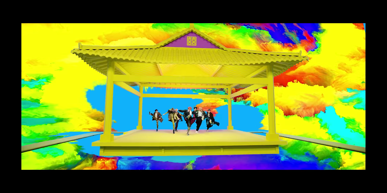 'DNA'에서는 이 화려한 색상들이 그저 철근이나 배경 정도로 쓰였지만, 'Idol'에선 기둥이 있는 건축물로 묘사되어 어떤 공간과 세상이 이루어졌음을 보여준다. 바로 '정체성'이자, '자신감'이다. 그 안에서 절도 있게 춤을 추는 멤버들의 춤사위가 강렬하다.