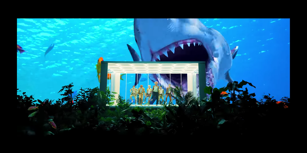 In right side, you can see 'anti-fans' in shark shape. But BTS looks safe in the cage. And the cage stands for the stage and the display of cell phone. Many people in worldwide meet BTS through the display & stage, and BTS is safe with fan's cheering & Love!