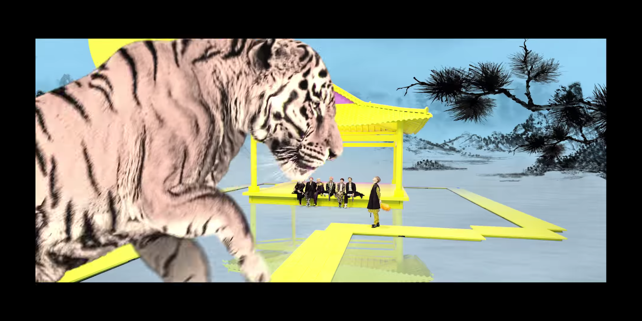 Tiger is the symbol of the Korean peninsular & spirit. So, BTS have strong confidence as Korean. And shows the wish that North & South Korea make re-union! The big mask of lion is from North Korea side standing for the celebrity's mask. So, they are in the mask and sing a song & dancing.