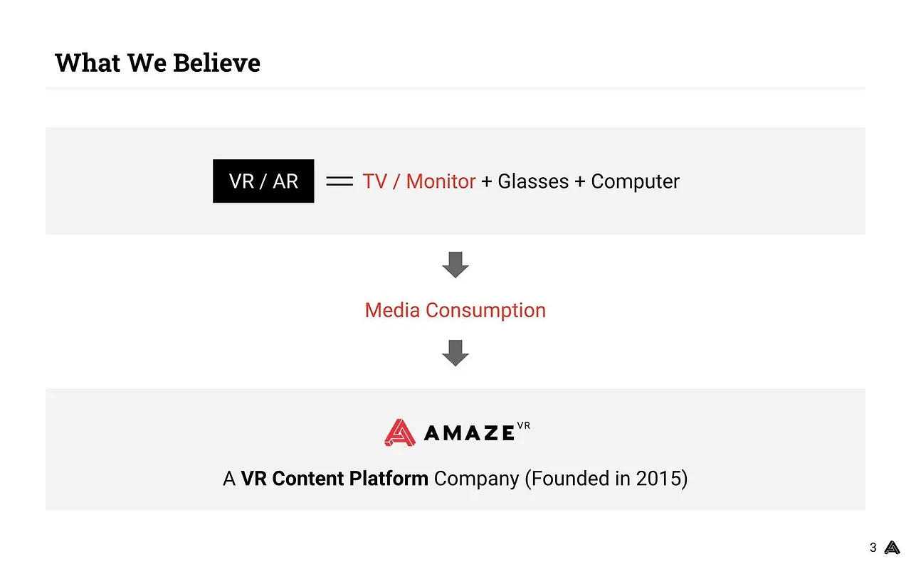 2015년 7월에 창업했을 때, 우리는 마치 아이폰이 일반 핸드폰을 대체하면서 열었던 모바일 시대와 같이 (운이 좋게도 우리 창업자들은 그 시대에 카카오에서 이를 직접 경험했었다.) TV와 스마트폰을 VR/AR 헤드셋이 대체할 시대를 그리면서 창업을 했다. 2018년에 첫번째 시리즈 A 투자를 받았을때 아래 Pitch Deck 에서도 그 생각을 볼 수 있다.