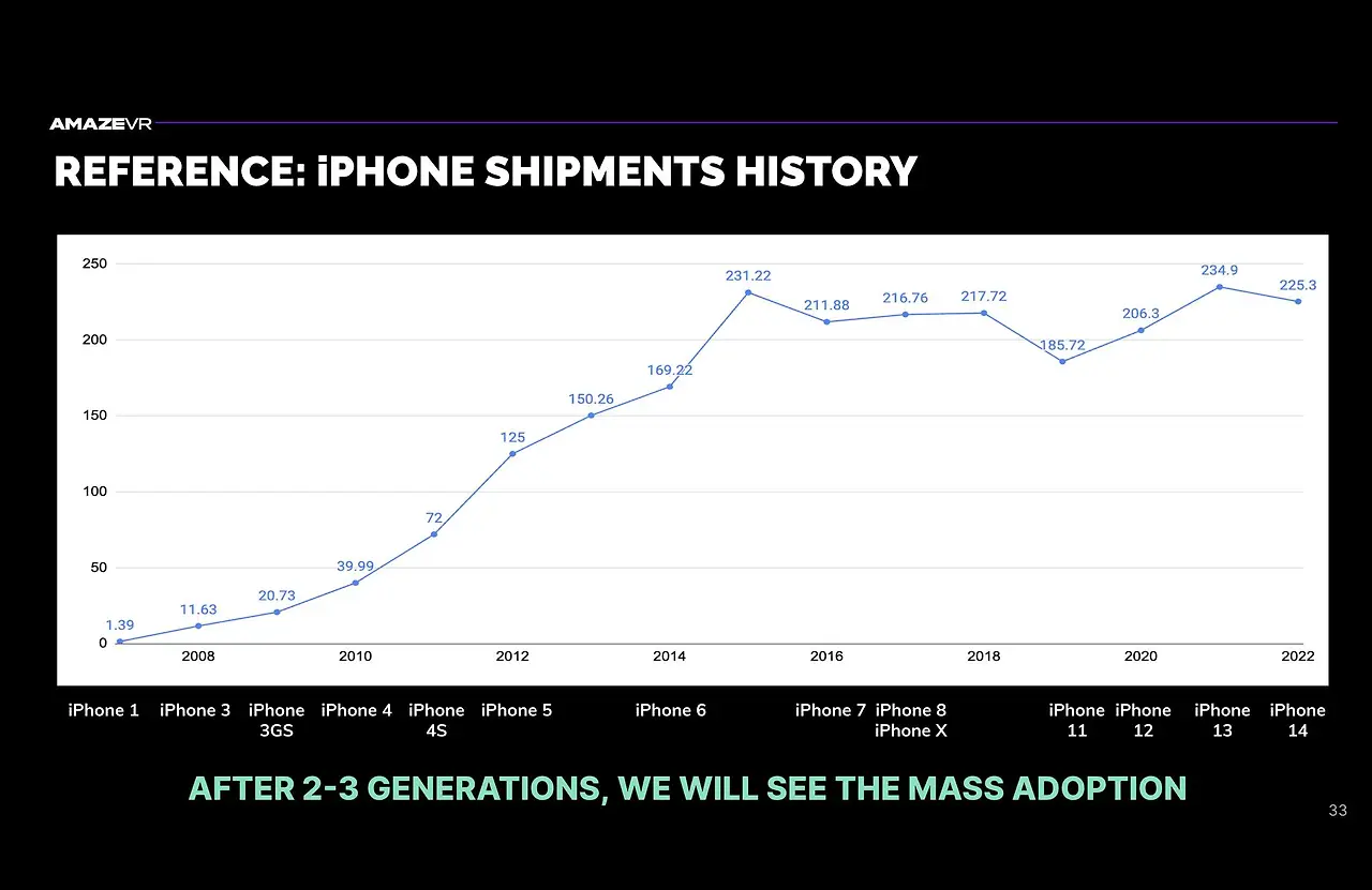 다만, 너무 조급하지는 않는다. 한국의 우리는 2009년 11월 28일에 처음으로 런칭한 아이폰 3GS를 봤다. 그 전의 아이폰 1, 아이폰 3를 보지 못했다. 실제로 아래 그래프에서 볼 수 있듯이, 아이폰도 1세대가 런칭된 해인 2007년에는 139만 대를 팔았고, 2세대인 iPhone 3G가 런칭된 2008년에 1,163만 대, 3세대인 iPhone 3GS가 런칭된 2009년에 2,073만 대를 팔았다. Apple Vision Pro도 결국 2번째, 3번째 세대에서 의미 있는 대중화된 기기가 나올거다. 2-3년 뒤에 정말 많은 혁신들이 가능해질 것이다. 그리고 우리도 거기에 일부를 기여할 것이다.