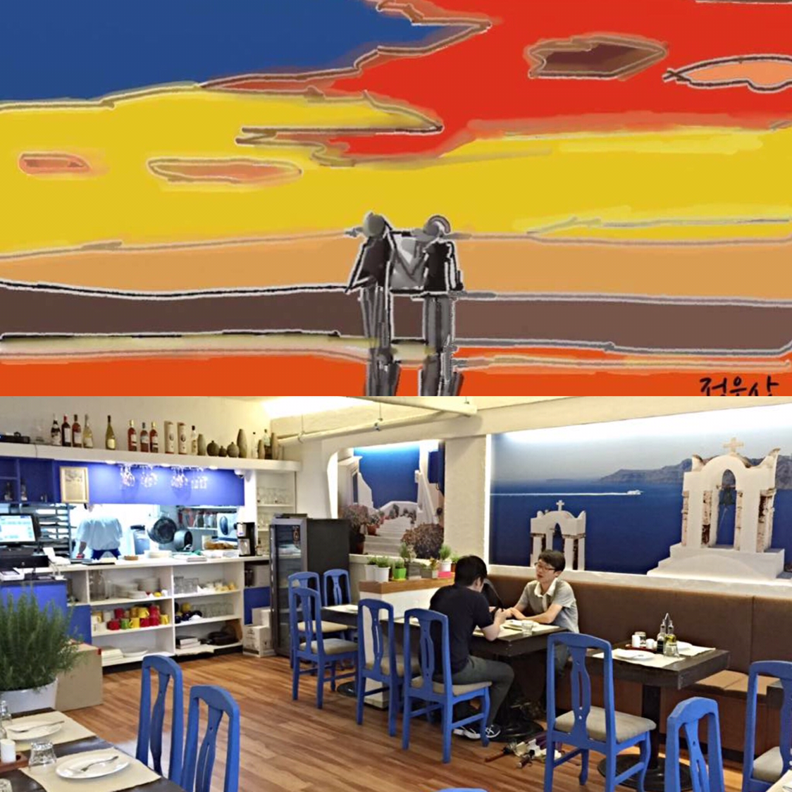 나도 화가다. 그것도 글로벌 화가다. 내가 아이패드로 그린 그림을 지난해 합정역 그리스음식점 그릭조이에 걸어 놓았는데 지난주 제주 서귀포에 있을 때 그릭조이에 식사하러 왔던 여성 외국인이 사갔다고 한다. 나의 스마트 그림 사부 정병길 화백의 지도를 받아 평소 노년의 인생을 더욱 아름답게 살자는 뜻으로 주로 노을sunset이라는 주제로 그림을 즐겨 그린다. 다른 그림도 함께 걸려 있었는데 유독 내 그림에 꽂혀 그걸 사간 것이다. 신기하고 놀랍고 흥분되고 자랑스럽기도 하다. 살다보니 이런 날도 ㅎㅎ