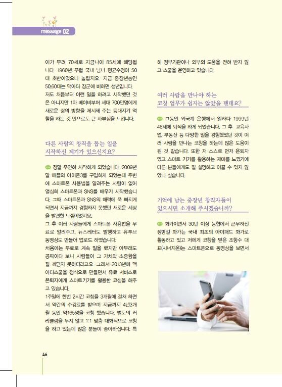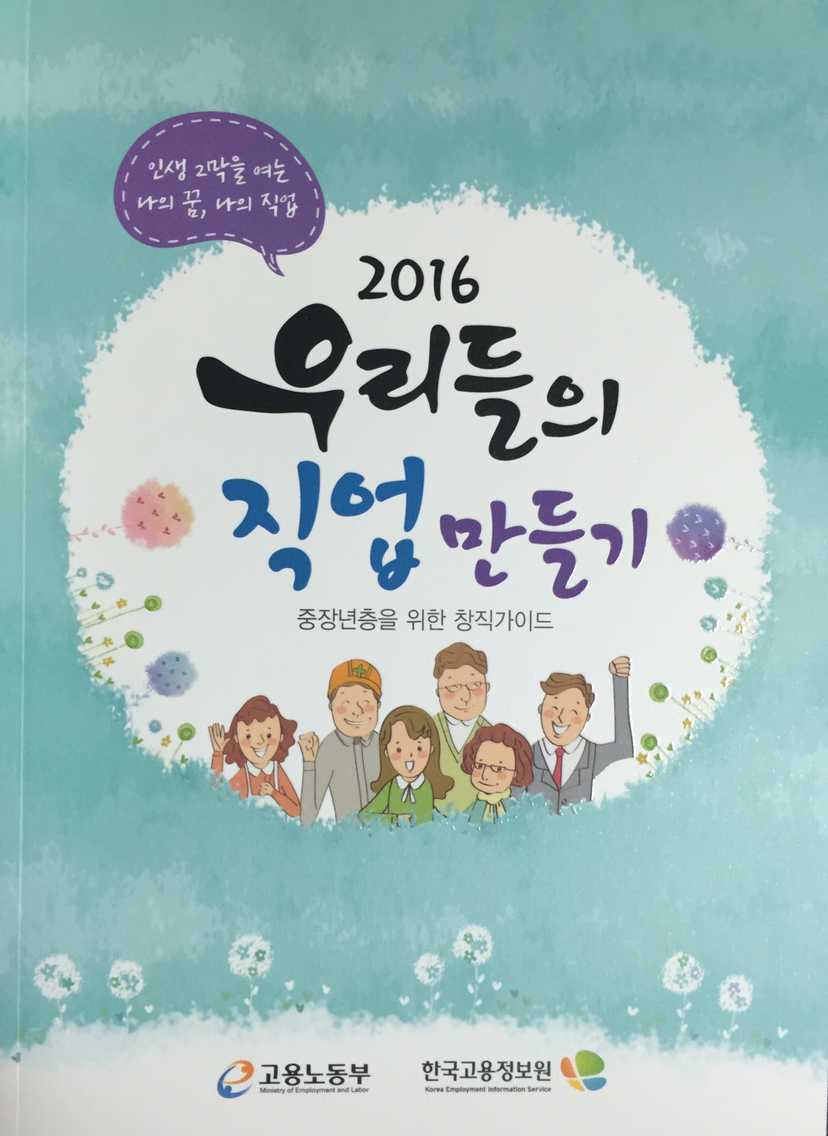고용노동부/한국고용정보원에서 발간한 '2016 우리들의 직업 만들기'에 맥아더스쿨 창직 사례가 소개되었습니다. 정병길 갤럭시 화가, 조항수 모바일 요리스쿨, 남기선/신영도 여행코치 등.이 중장년을 위한 창직가이드는 비매품이며 한국고용정보원 http://keis.or.kr 에서 PDF로 다운로드 할 수 있습니다. 1년에 한번씩 발간되는 유익한 자료입니다.