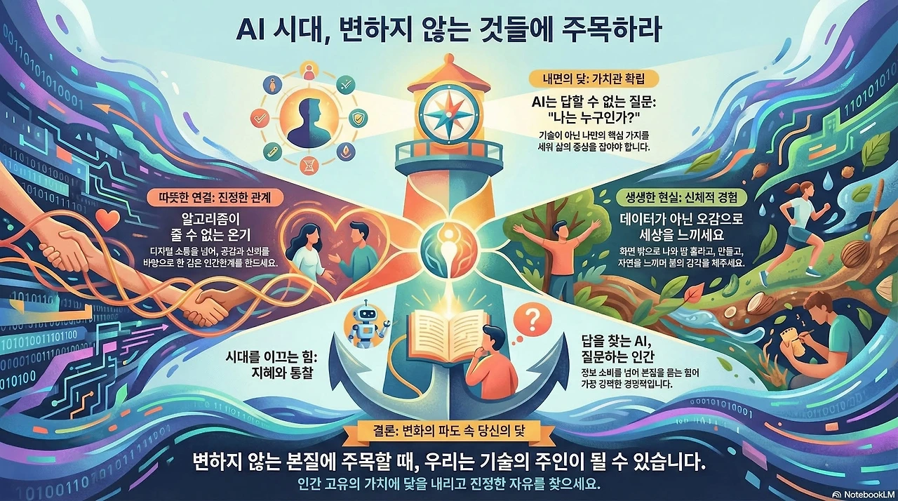 폭풍우가 치는 거친 바다 위에서 배가 중심을 잃지 않고 표류하지 않는 이유는, 깊은 바다 밑바닥에 단단히 내린 닻 덕분입니다. 인공지능이라는 거대한 변화의 파도는 앞으로 더욱 거세게 우리 삶의 기반을 흔들어 놓을 것입니다. 그러나 우리가 인간의 고유한 본성, 도덕적 가치관, 관계의 소중함, 그리고 본질을 꿰뚫는 지혜라는 변하지 않는 가치에 인생의 닻을 내린다면, 변화는 위협이 아니라 새로운 세계로 나아가기 위한 강력한 동력이 될 것입니다.