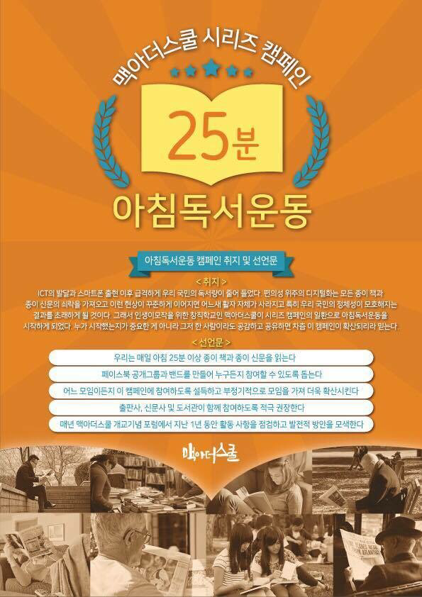 독서하기 아주 좋은 계절입니다. 맥아더스쿨 시리즈 캠페인 아침독서운동에 참여해 보시죠? 매일 몸을 위해 음식을 먹어야 하듯 매일 독서를 통해 정신을 더욱 풍요롭게 합니다. 동참하실거죠?