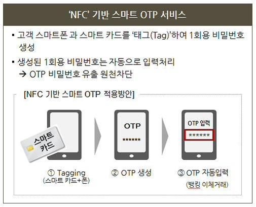 In My Opinion : 핀테크 산업의 발전에 따라 전자금융거래에 다양한 인증수단이 제안되고 있다. 카드형 스마트OTP는 보안성이 취약한 보안카드와 두껍고 항상 소지하고 다니는 불편한 토큰형 OTP를 대체하기 위해 등장했다. 이렇게 스마트OTP가 주목을 받으며 각 은행마다 서로 다른 핀테크 기술을 활용한 스마트OTP를 선보이고 있다.