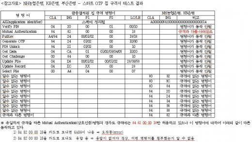 이와 같이 A사 스마트OTP는 금융결제원의 규격서뿐만 아니라 스마트카드와 단말기, 시스템 간 통신을 위한 기본 명령어에 대한 국제표준인 ISO 7816-4도 무시하고 있다고 지적했다.