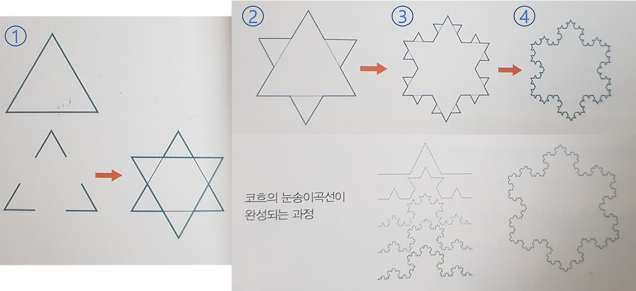 이 과정을 무한히 반복하면 ④와 같이 둘레가 점점 복잡해진 눈꽃 결정의 모양을 갖는다.