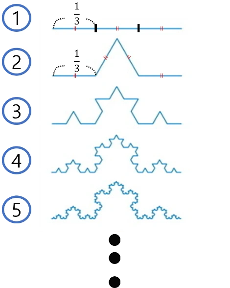 정삼각형의 각 변을 세 등분하고 가운데 부분을 없앤다. 각 변의 없앤 부분 위에 그만큼의 길이를 한 변으로 하는 정삼각형을 만든다. 이 과정을 ①이라 하자. ②와 같은 결과를 얻는다.