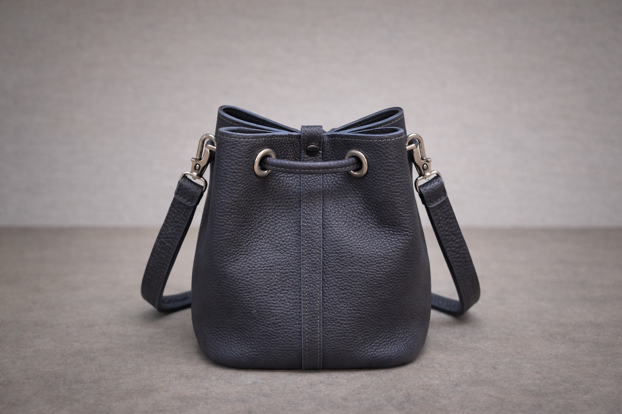가방을 들어 올렸다. 그리 크지 않고 윗부분이 좁아지는 모양이었다. 어깨에 걸자마자 모든 소재가 합쳐진 묵직함이 느껴졌다. 입구에 손을 넣고 빼기를 반복했다. 작업대 위에 다시 세웠다.