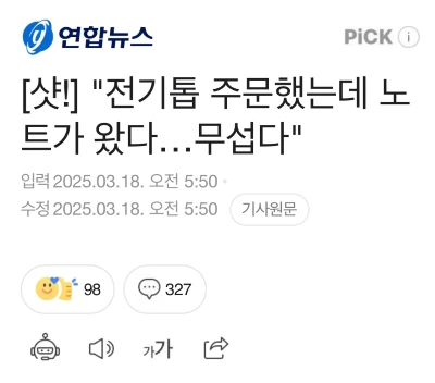 그는 "전기톱을 주문했는데 노트가 배송 왔고 무선 드릴을 샀는데 알 수 없는 물품이 왔다. 당황스럽고 무섭다"라고 밝혔다.