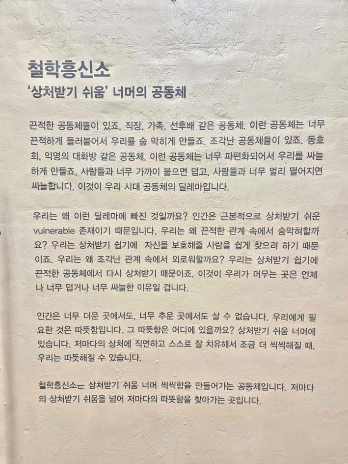 ‘철학’을 배우는 동안, 제가 얼마나 긴 시간 동안 감정과 욕망을 무시하고 억누르며 살아왔는지 알게 되었어요. 어느 사이, 제가 무엇을 할 때 기쁘고 슬픈지조차 알 수 없는 사람이 되어버린 거였어요. 좋아하는 것을 좋다고, 싫어하는 것을 싫다고 말하지 못하는 사람이 되어 있었어요. 그래서 제 삶이 시들고 영혼은 말라가고 있었던 거였어요.