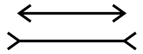 어느 쪽이 선이 더 길어 보일까? 아래쪽 선이 더 길어 보인다. 하지만 실제로는 두 선의 길이는 같다. 이런 종류의 착시들은 인간의 지각 능력이 얼마나 불완전한지를 드러낸다. 여기서 중요한 점은 인간이 가진 지각 능력의 불완전성이 의식(생각, 판단)의 불완전성으로 이어진다는 사실이다. 생각하고 판단하기 위한 정보를 지각을 통해서 받아들이게 되는 까닭이다. 즉, 무엇인가에 대해 생각하고 판단 내리는 것은 결국 무엇인가를 보고, 듣고, 만지는 지각 능력에 절대적으로 의존하게 마련이다.