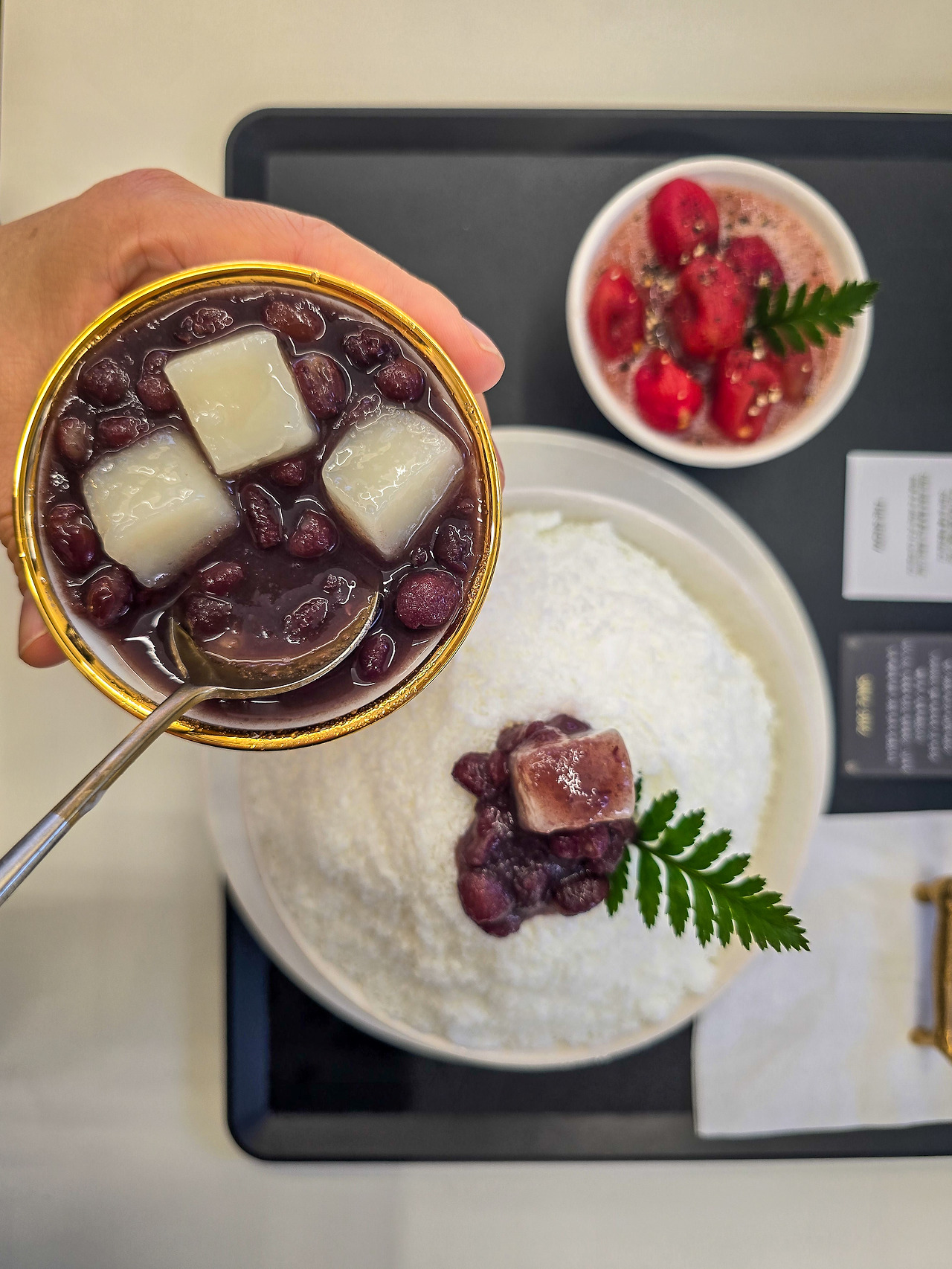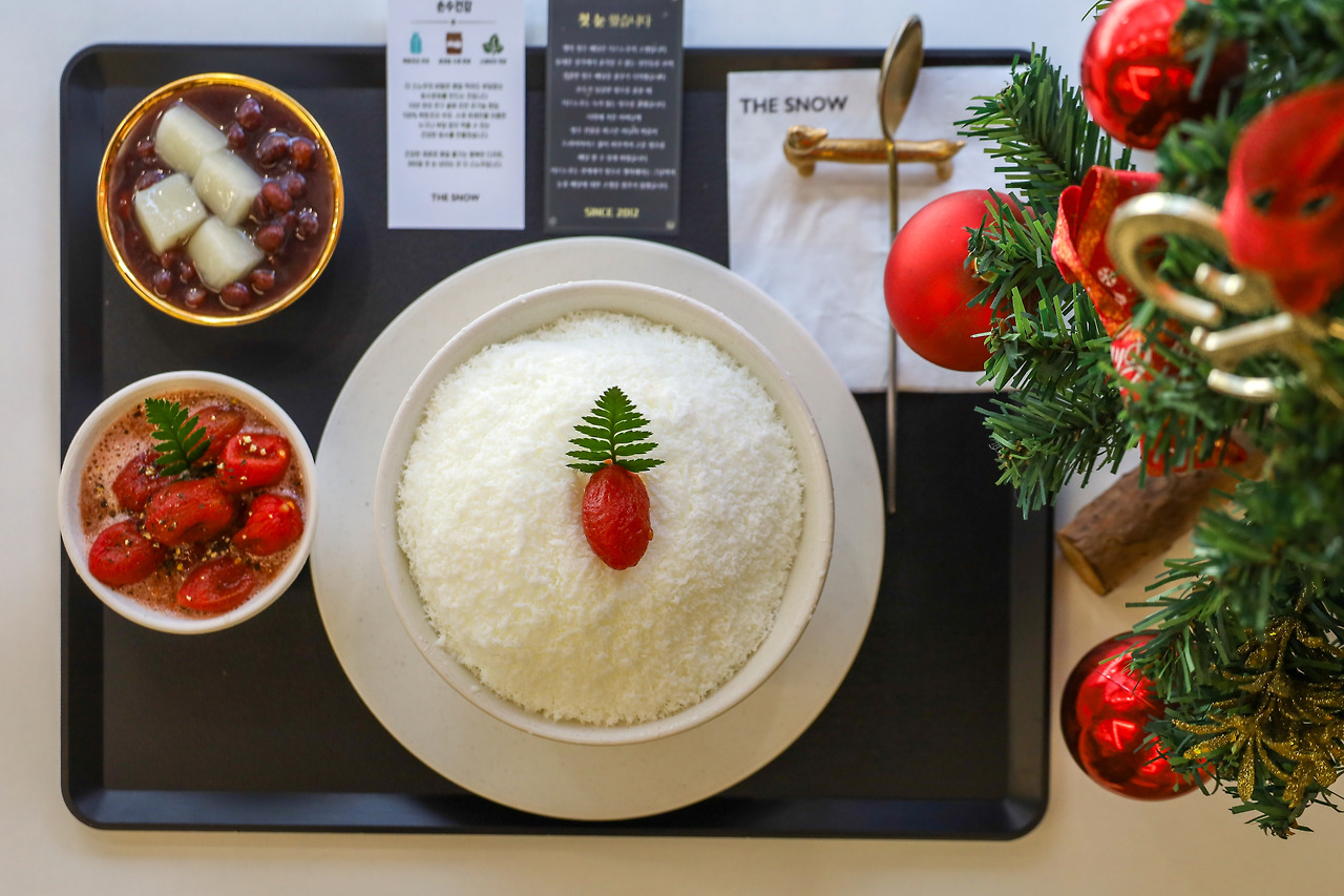 꿀에 절인 토마토를 따로 그릇에 담아 토마토 빙수를 끝까지 즐길 수 있도록 해주는 넉넉한 인심도 더 스노우 카페의 인기 비결이다. ‘꿀 생자몽 빙수’도 자몽 특유의 쌉싸름한 맛보다는 달콤한 맛이 진하다. 어떤 빙수 메뉴를 시키든 찹쌀떡이 들어간 단팥소가 추가로 나와서 과일빙수와 팥빙수 두 가지의 풍성한 눈꽃빙수 맛을 즐길 수 있다.