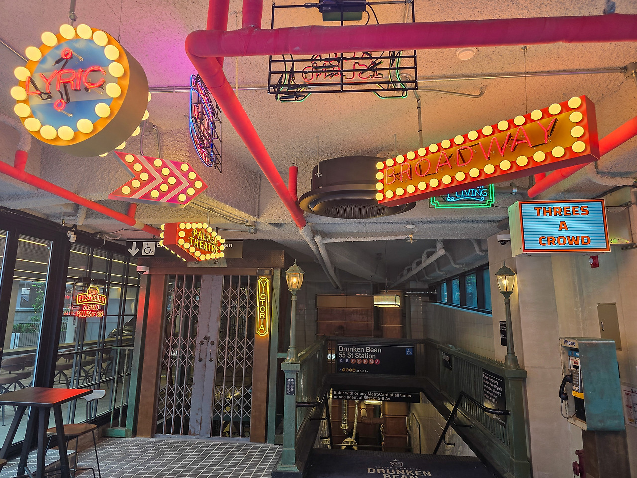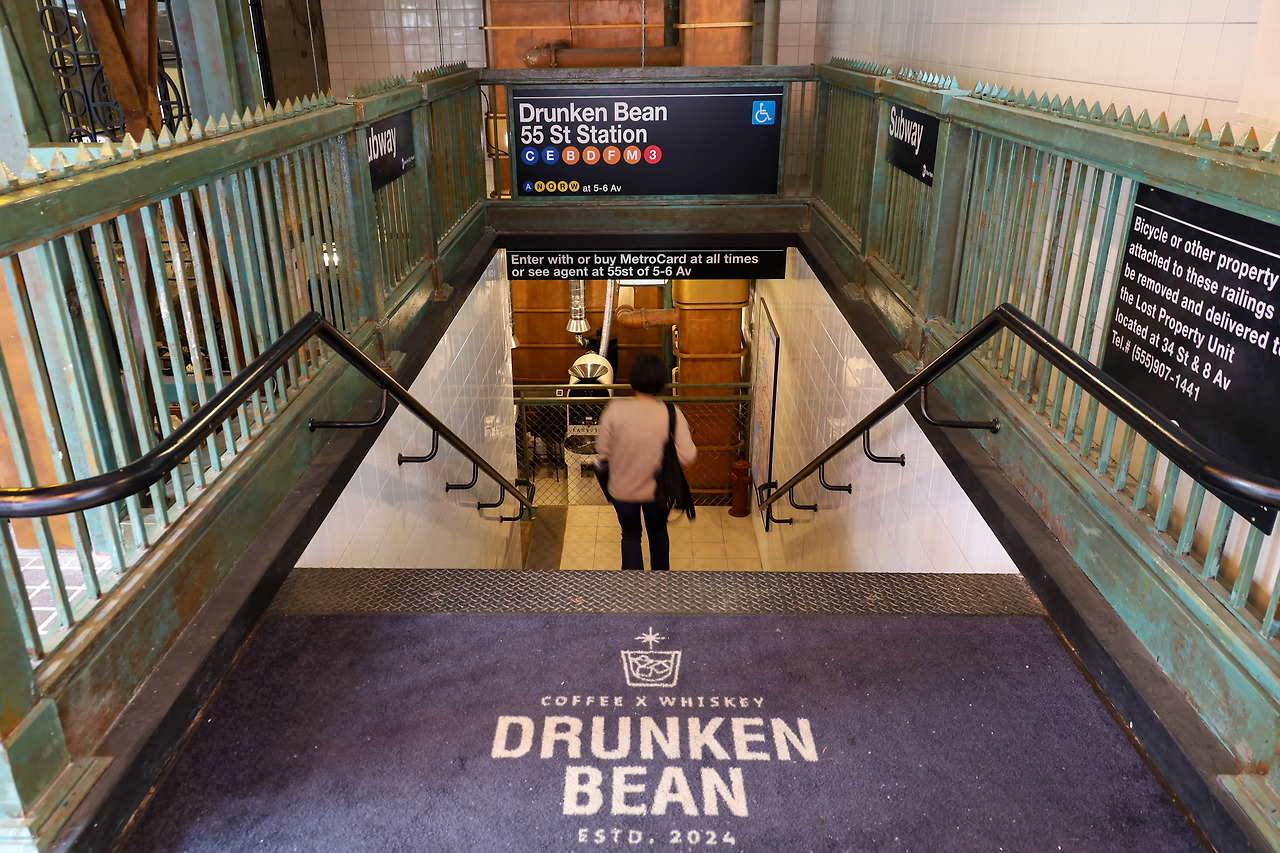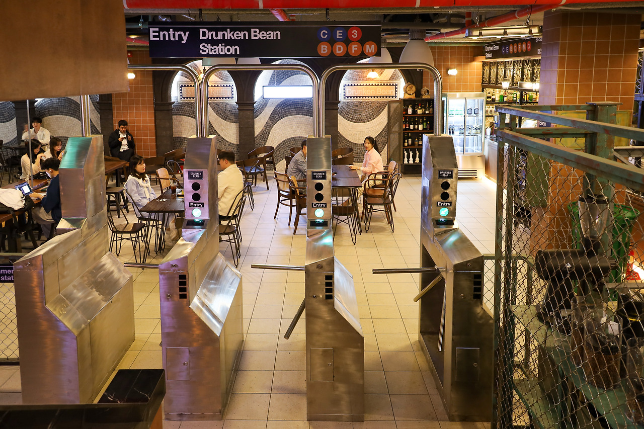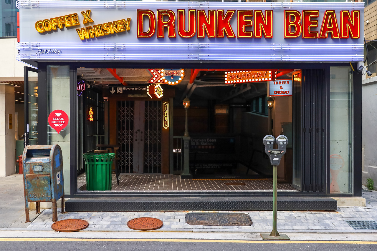 뉴욕 지하철 개찰구와 똑같이 꾸며놓은 입구를 지나 지하 1층으로 들어서면, 뉴욕 여행의 추억을 가진 사람에겐 애틋한 시간여행이 시작된다. 드렁큰 빈 건물 지하1층과 2층은 뉴욕 지하철 컨셉의 카페, 3층은 갤러리 분위기의 카페, 4층과 5층 실내는 위스키 바로 운영되고 5층 루프탑은 시원한 야외 분위기를 만끽하는 공간이다.