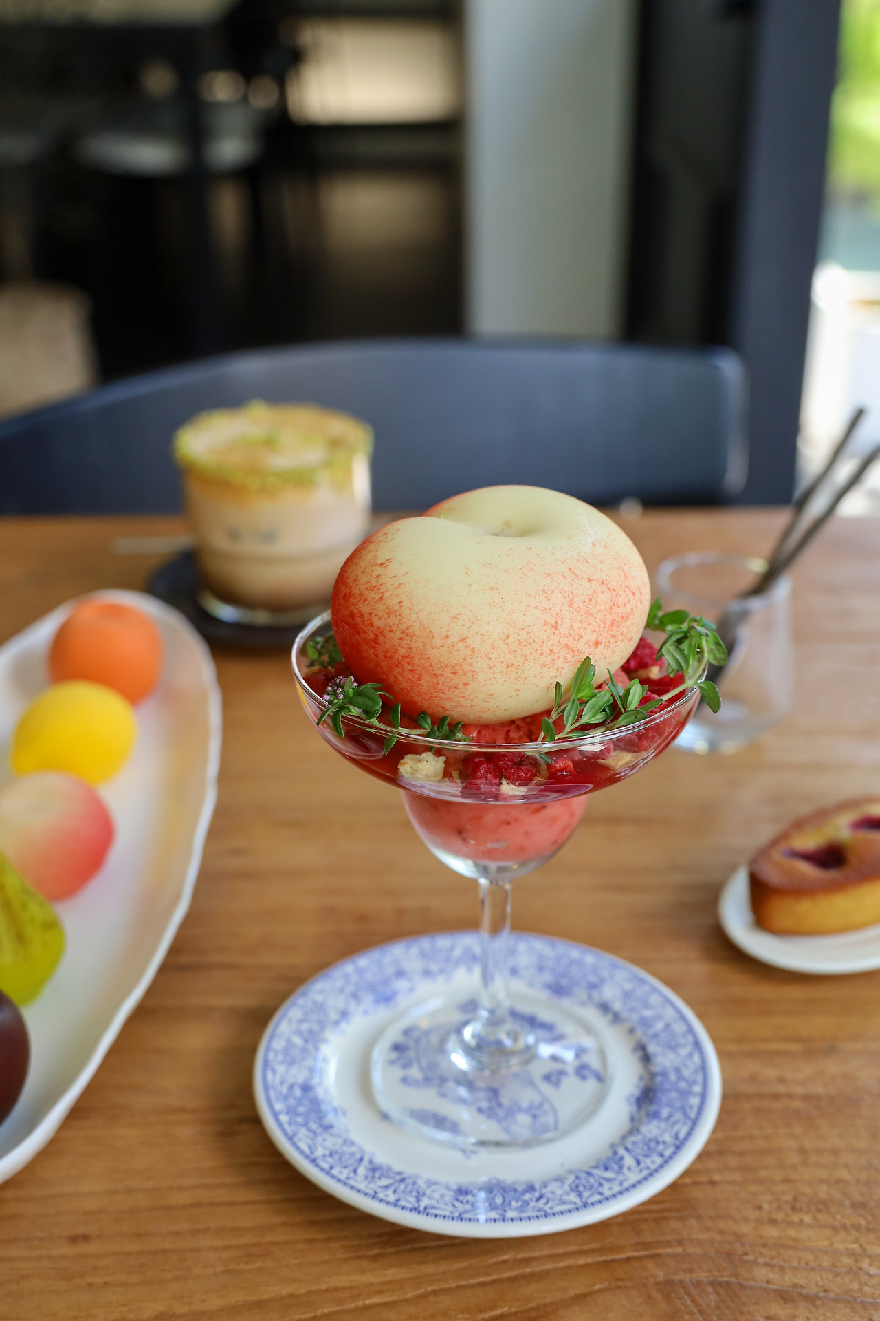 ‘후르츠 피치 멜바’는 부드러운 복숭아 과육이 달콤하게 씹히고 유리컵 안에 장식한 산딸기 소르베가 상큼하게 어울린다. 복숭아의 은은한 단맛과 과일 향의 균형감이 매력적이다. 납작복숭아의 예쁜 비주얼과 달콤한 파르페는 한여름 무더위도 잊을 만큼 색다른 디저트의 향연이다.