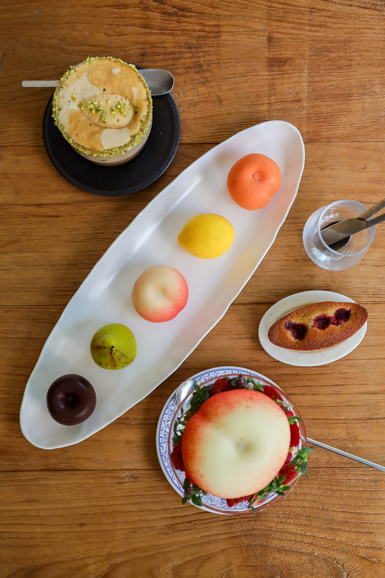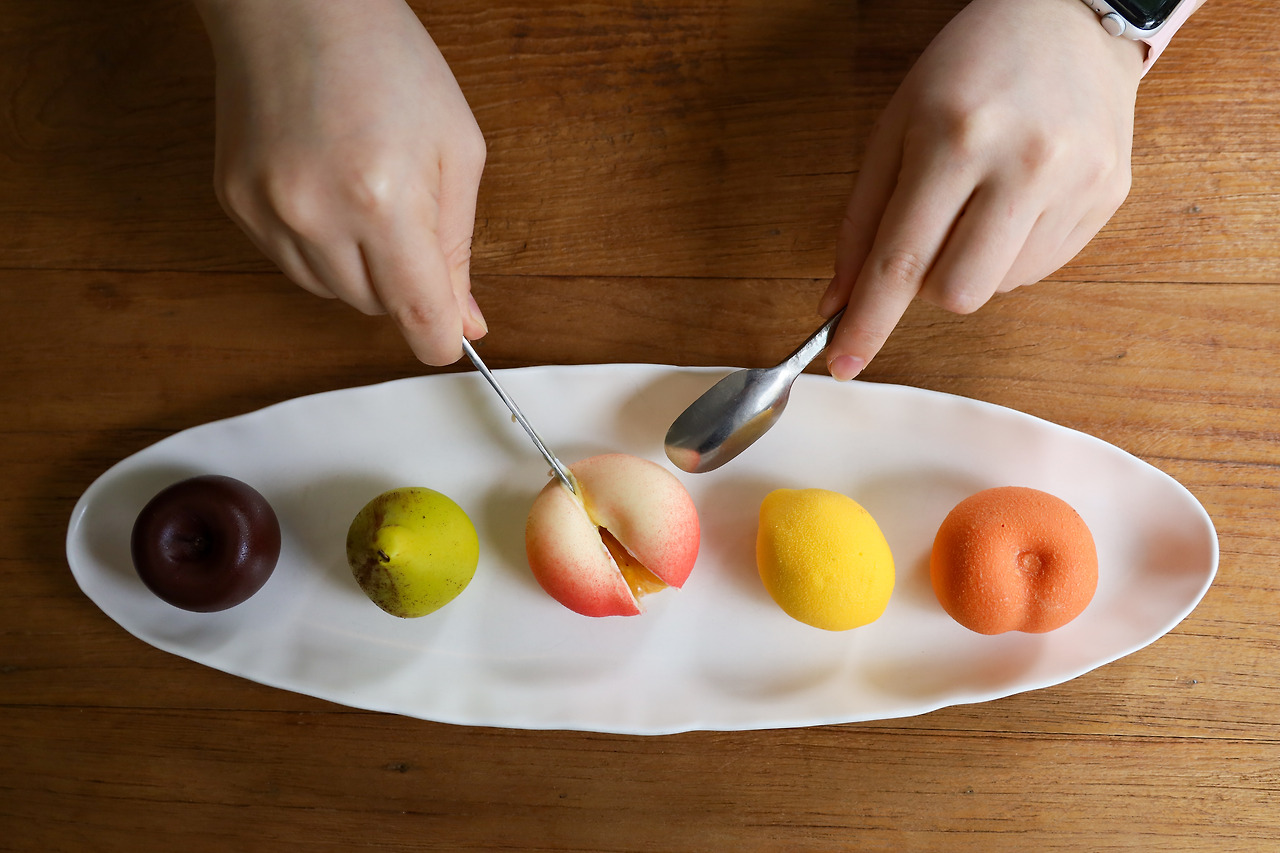 실물 납작복숭아보다 더 진짜 같은 납작복숭아는 사실 화이트초콜릿 코팅 안에 복숭아 과육, 요거트 가나슈, 무스 등으로 만든 과일 무스케이크다. 쇼케이스에는 다섯 가지 과일 맛으로 만든 ‘카페 그르망 쁘띠 프뤼’도 특별한 맛이다. 살구, 유자, 복숭아, 배, 체리 맛의 과일 무스케이크는 초콜릿과 과일 특유의 향기와 맛이 절묘하게 어우러진다.