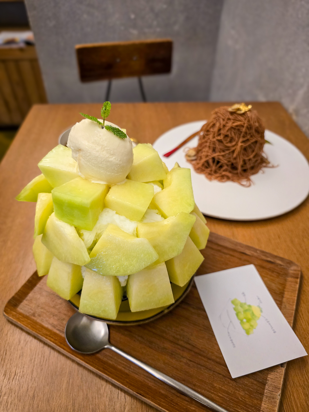 추천 메뉴 멜론 빙수 35,000원, 밤 몽실 타래 치즈케이크 18,000원