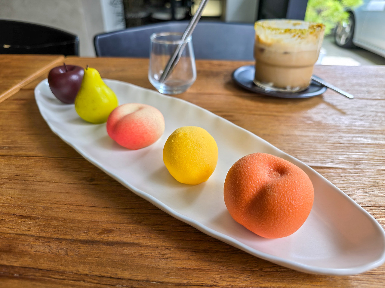 카페 파티세리 후르츠는 압구정 로데오 골목 안에 있어 한적한 분위기가 이국적인 외관과 어울려 여유롭다. 셰프가 만드는 파인 디저트 매장인 파티세리 후르츠는 이름에서 느껴지듯 과일을 주제로 하는 디저트 카페다. 입구에 놓인 쇼케이스 안에 잘 익은 납작 복숭아가 눈길을 사로잡는다.